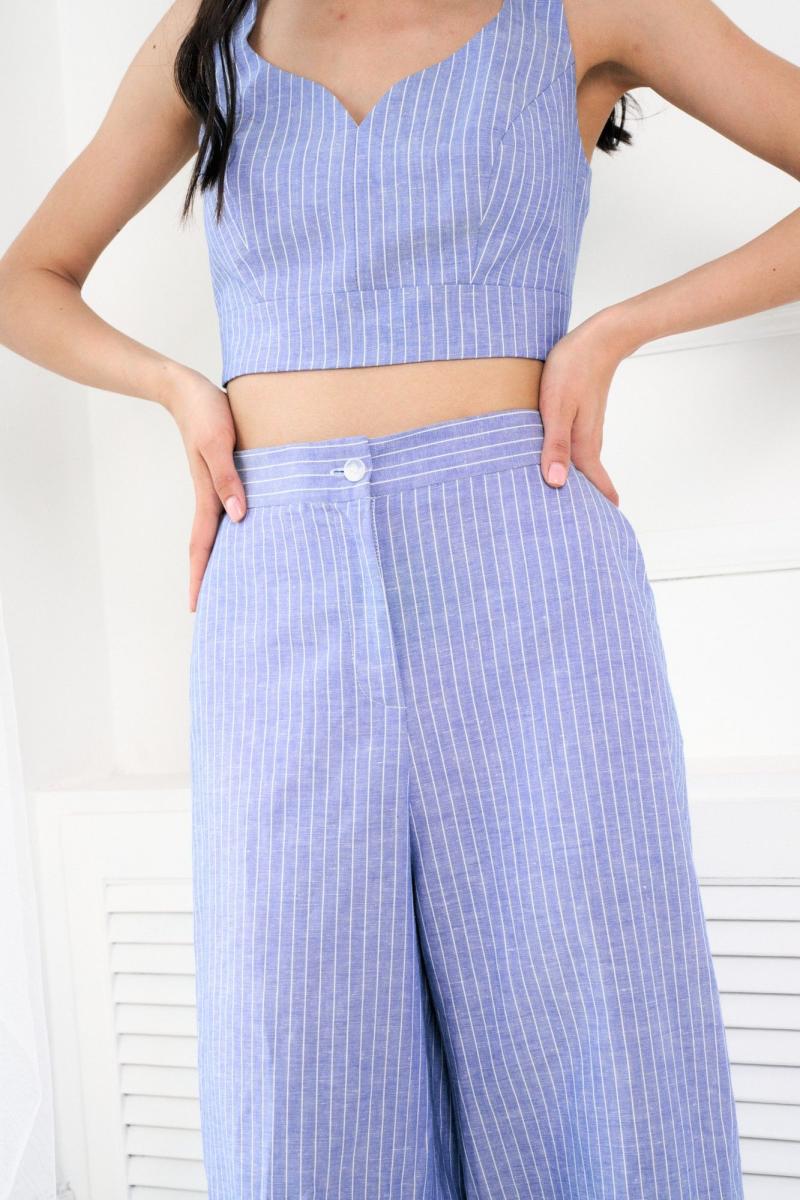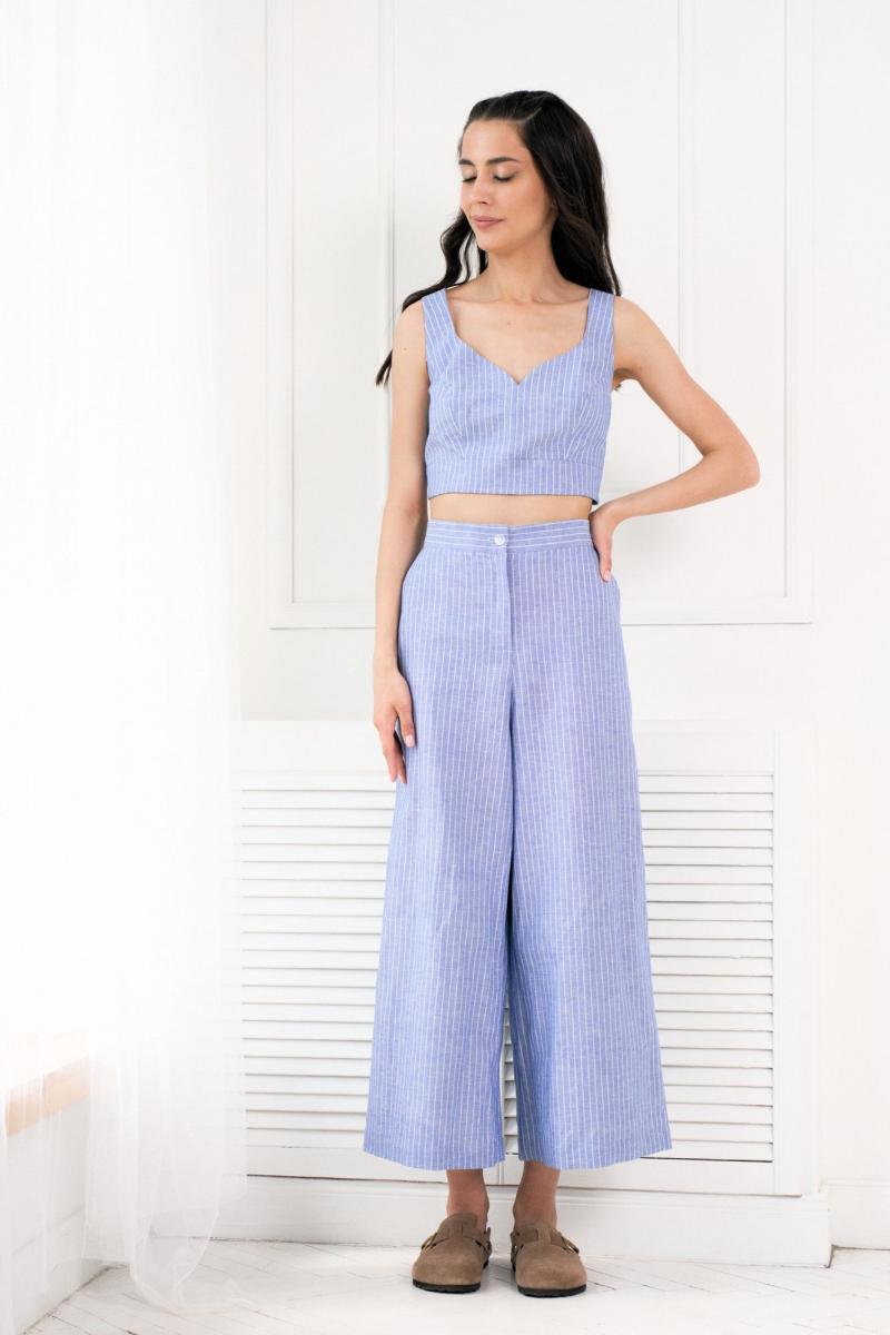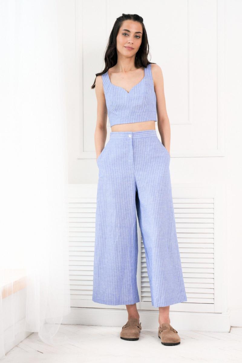 Комплект двойка состоит из топа и брюк. Топ на широких бретелях выполнен из льняного полотна голубого цвета в полоску, фигурный вырез горловины, широкие бретели, по переду изделия вытачки, сбоку изделия потайная молния. Брюки свободного кроя, расширенные к низу изделия, выполнены из льняного полотна голубого цвета в полоску. Брюки на поясе, по спинке на резинке, по бокам изделия функциональные карманы.