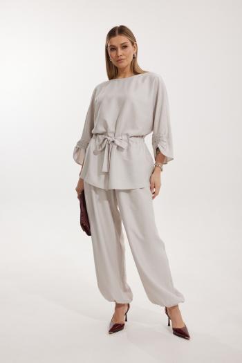 Комплект женский брючный, состоящий из жакета и брюк. Жакет полуприлегающего силуэта до линии бёдер, двубортный, воротник отложной с лацканами, рукав втачной, застёжка спереди на петли и пуговицы, по переду-прорезные карманы с листочкой, спинка со средним швом и рельефами, изделие на подкладке. Брюки классические, со стрелками, зауженные к низу, на поясе-кокетке, застёжка спереди на молнию и пуговицы, боковые карманы со скосом.