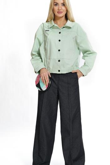 Костюм женский двухпредметный , полуприлегающего силуэта Выполненный из костюмной ткани высокого качества . Жакет с однобортной застежкой , рукав втачной двухшовный с декоративной шлицей снизу . Воротник стояче - отложной с отворотами лацканов . По переду жакета также функциональные карманы с клапанами . Жакет на подкладке. Брюки свободного силуэта с двумя складками и карманами вверху. Верх брюк обработан подкройным поясом .