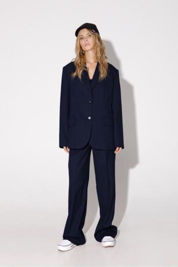 Жакет из мягкого полотна с дизайном полоска, прямого силуэта, длиной ниже линии талии, с втачными рукавами, длиной до запястья, застёжка центральная на молнию. Низ жакета и рукавов присобран эластичным довязом, вдоль молнии отделочные планки. На уровне талии, на чёрной полосе расположены настрочные листочки с пуговицей по центру. Горловина округлой формы.
