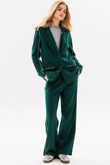 Комплект женский, состоит из жакета и брюк. Жакет из мягкого полотна с дизайном полоска, прямого силуэта, длиной ниже линии талии, с втачными рукавами, длиной до запястья, застёжка центральная на молнию. Низ жакета и рукавов присобран эластичным довязом, вдоль молнии отделочные планки. На уровне талии, на чёрной полосе расположены настрочные листочки с пуговицей по центру. Горловина округлой формы. Брюки из гладкокрашенного трикотажного полотна средней плотности, с посадкой на талии, с высокой кокеткой. Брюки длиной ниже щиколотки. Передние половинки с застроченными стрелками по центру, задние - без особенностей. Застёжка на потайную молнию в левом боковом шве.