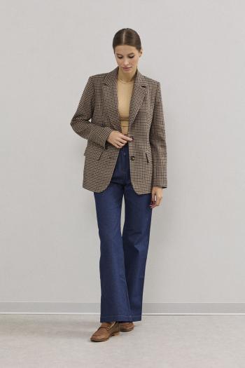 Жакет свободного кроя, со спущенной линией плеча, длиной ниже линии талии, рукава длиной до запястья. Воротник стояче-отложной на круглой горловине, застёжка центральная на декоративную молнию. Детали переда с вертикальными карманами с молнией, расположенными на уровне талии. Спинка без особенностей. Рукава со шлицей в локтевом шве и складкой по шву притачивания манжет, застёжка манжет на пробивную кнопку. Низ жакета присобран. Жакет на подкладке.
