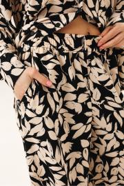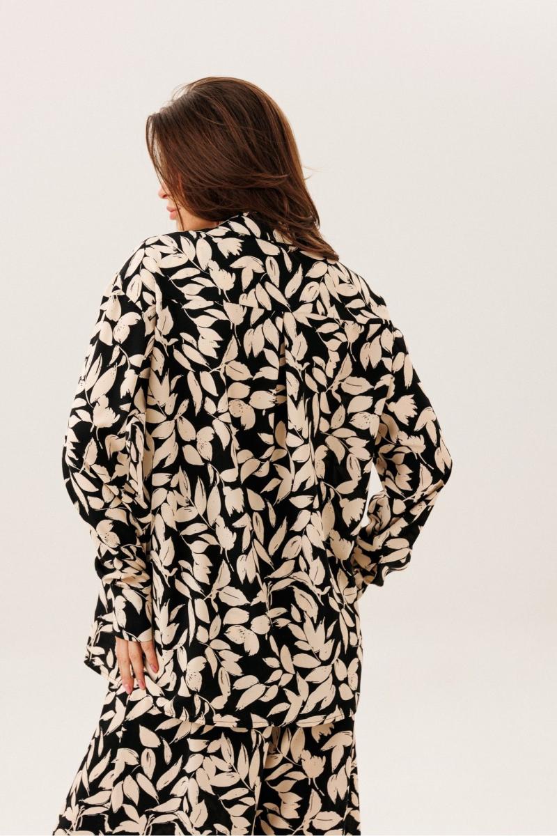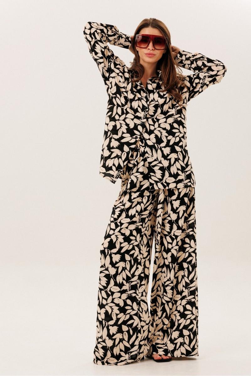 Комплект женский свободного силуэта, состоит из блузки и брюк. Блузка удлиненная чуть ниже бедер прямого силуэта. Воротник рубашечного типа. Рукав с манжетой на две кнопки. По боковым швам разрезы. Застежка на кнопки.Брюки широкие с притачным поясом на резинке и карманами по боковым швам.