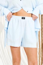 Комплект 2-х предметный, состоящий из блузки и шорт. Блузка свободного объема, прямого силуэта, с фигурной линией низа, центральной застежкой на петли и пуговицы. Горловина оформлена отрезной стойкой. Боковые швы заканчиваются разрезами с декоративными завязками. Рукав втачной, одношовный, длинный. Нижний срез рукава с двумя односторонними складками и разрезом, обработан притачной манжетой с застежкой на одну петлю и одну пуговицу. Шорты умеренного объема, прямого силуэта. В боковых швах расположены карманы. Пояс притачной, на резинке с отделочными строчками, с настрочной декоративной нашивкой по переду. Длина блузки на модели вдоль середины спинки — 80 см, длина шорт на модели вдоль бокового шва с учетом пояса — 39 см (допустимое отклонение +/- 1 см)