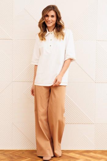 Костюм женский состоящий из туники и брюк, туника прямого силуэта с ассиметричным вырезом до бедра, и накладным карманом по линии груди. Рукава втачные с широкой манжетой по низу.. Брюки зауженные к низу, на притачном поясе с резинкой и завязкой.В боковых id[ брюк расположены карманы