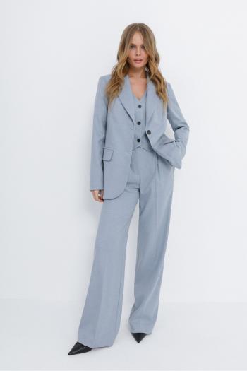 Костюм женский выполнен из льна-вишера. Костюм состоит из брюк и блузона. Брюки зауженные к низу на притачном поясе с резинкой. В боковых швах имеются функциональные карманы. Блузон из ткани в полоску с асимметричной молнией по переду. Горловина - асимметричная. Рукав – приспущенный с манжетам по низу. Спинка с кокеткой и складкой. Низ – асимметричный