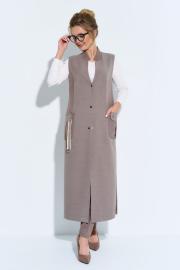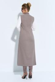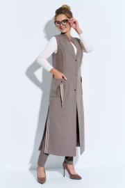 Женский брючный костюм двойка, состоящий из жилета и брюк. Жилет удлиненный, без подкладки. Горловина изделия воротник-стойка. Частичная застежка на пуговицы в области груди. Имеются нагрудные вытачки, обеспечивая комфортное прилегание. В области талии выполнены накладные карманы с декоративным элементом. В боковых швах по низу изделия разрезы, дополненные лентой. По спинке кокетка, средний шов и талевые вытачки. Брюки классические, комфортной посадки, зауженные к низу. Пояс - кокетка-обтачка со шлевками-кулисами, под декоративный ремень из репсовой ленты. Застежка на две пуговицы и молнию. В боковых швах брюк выполнены функциональные карманы. По задней половине брюк выполнена кокетка. Длина жилета по спинке – 116 см. Длина брюк по боковому шву - 96 см