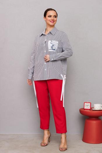 Костюм женский с рубашкой в полоску выполнен из костюмной ткани. В комплект входит: рубашка и брюки. Рубашка свободного кроя, по полочке изделия расположены накладные карманы. Рукав изделия длинный. Горловина отложной воротник на стойке. По спинке изделия расположена кокетка и декоративный вырез с бантом. Застежка на рубашке : петли-пуговицы. Брюки прямого кроя на притачном поясе с резинкой. в боковых швах брюк имеются карманы, застежка молния на гульфике.