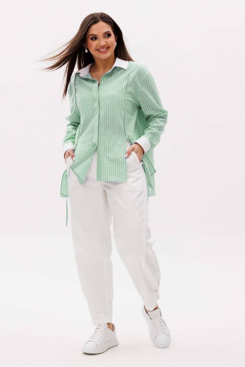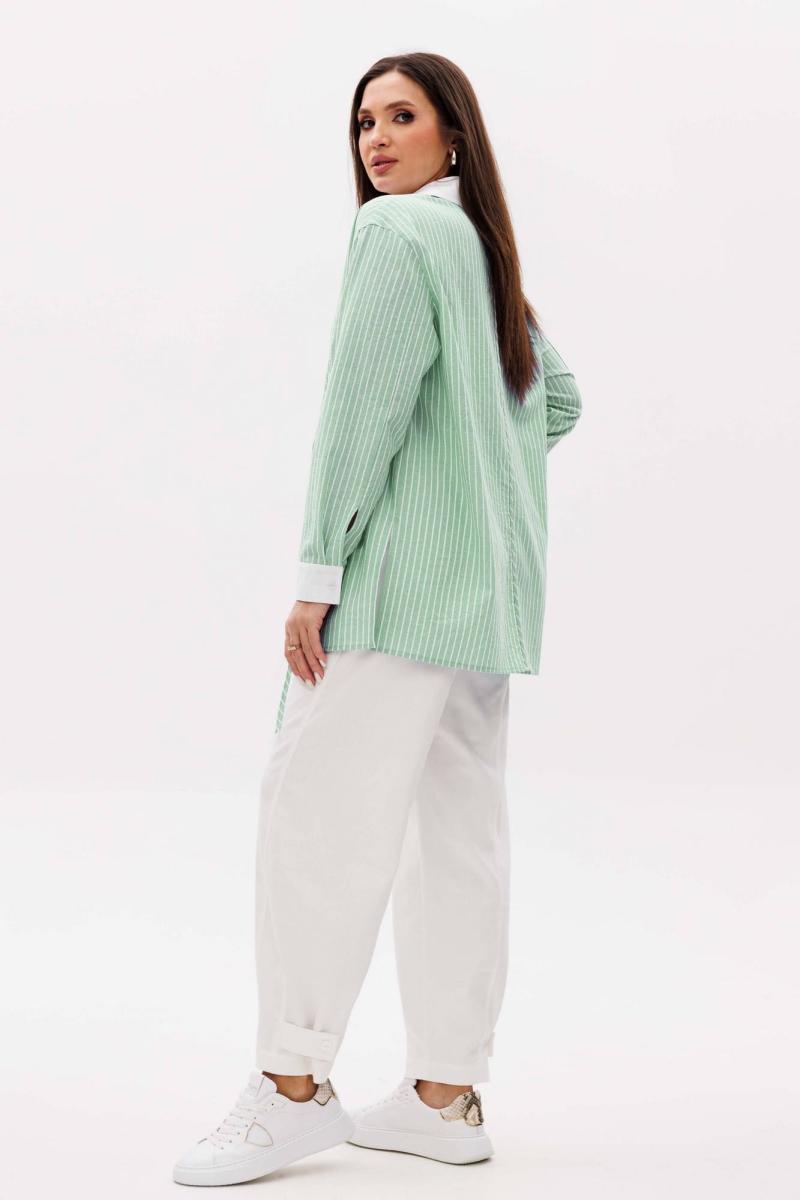 Свободный расширенный силуэт, рубашечный покрой, потайная застежка на петли и пуговицы, рубашечный рукав и воротник. Полочка с вертикальными рельефами, разрезом и отделкой под углом 45 градусов. Спинка с центральным швом с отделкой из тесьмы под углом 45 градусов.