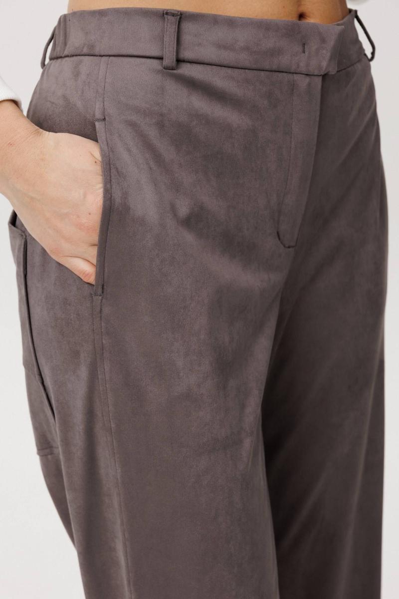 Брюки свободные, прямые на притачном поясе, эластичном в области спинки. Передние половинки с наклонными боковыми карманами. По боку-широкий лампас. Задние половинки брюк с отрезной кокеткой и накладным карманом с вытачкой.