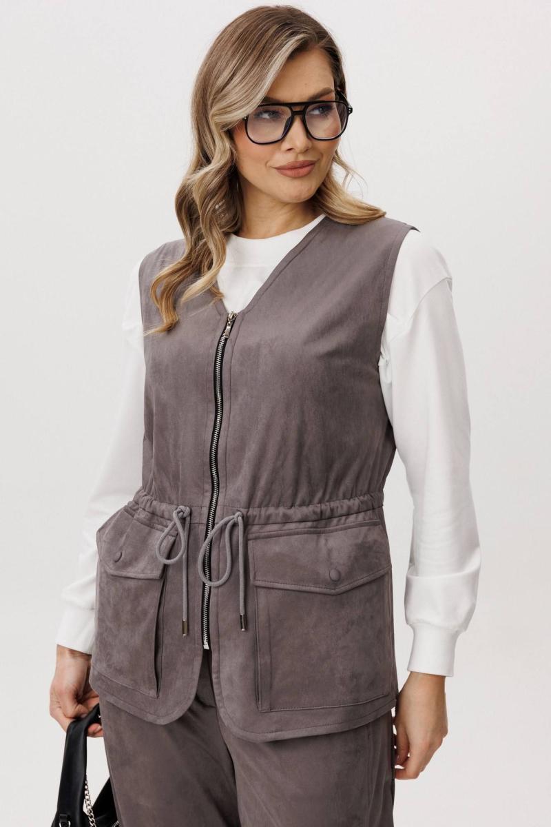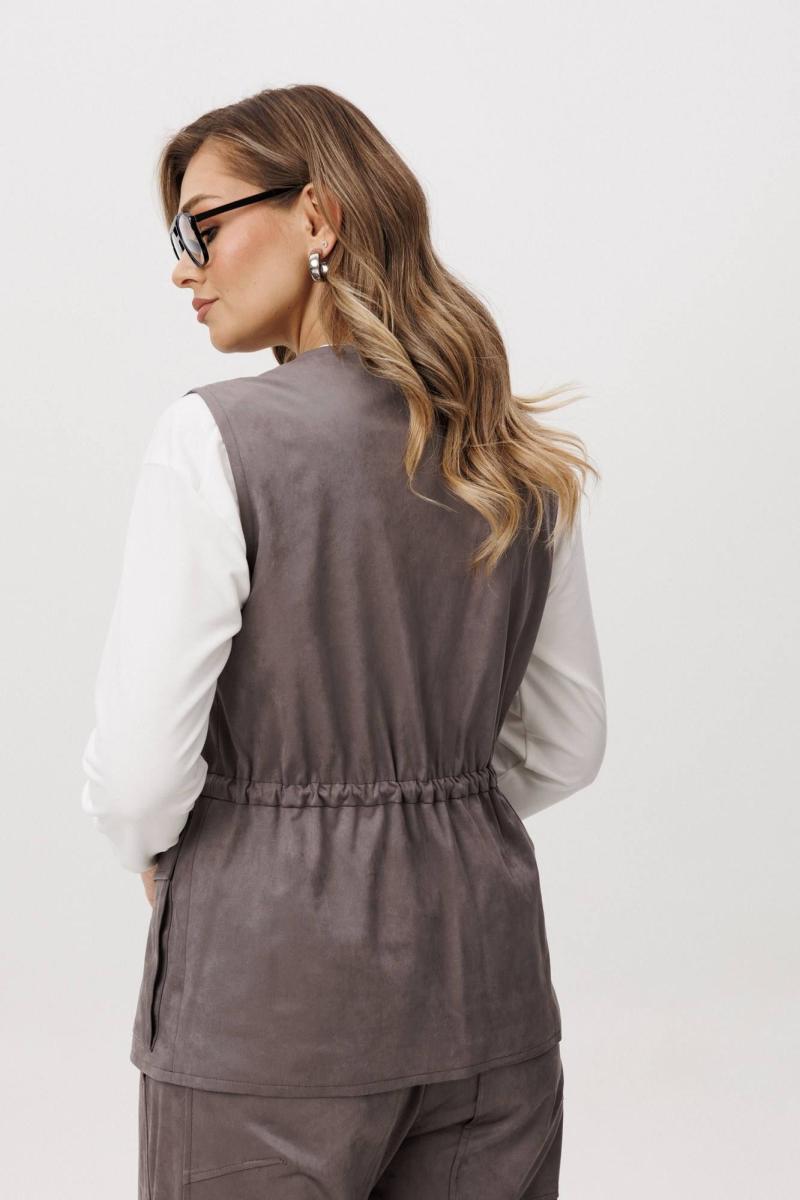 Образ, который говорит сам за себя, смелый и дерзкий, и в то же время очень комфортный. Нестандартный жилет с накладными карманами-пеналами с клапаном. Регулирующая кулиса, подчеркивающая талию. Свободный силуэт, центральная застежка на тесьму молнию, фигурная линия низа. Жилет на подкладке.