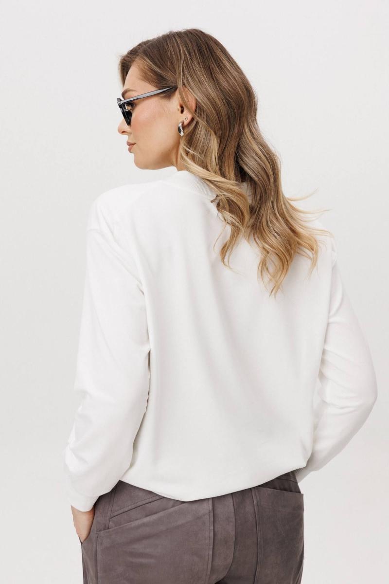 Свитшот свободный, с заниженной линией плеча, регулирующей кулисой с фиксаторами по низу изделия, притачными манжетами по низу рукава из отделочного полотна, горловина изделия также выполнена из этого материала.