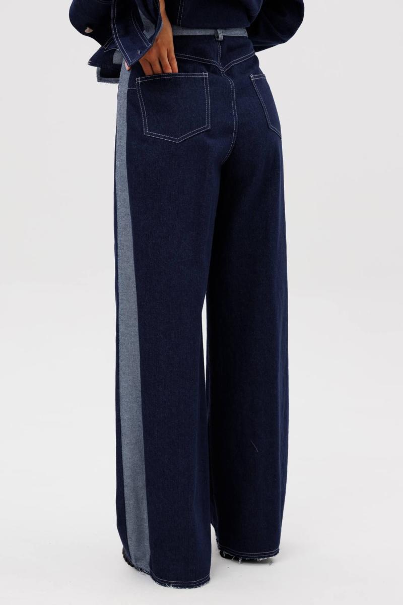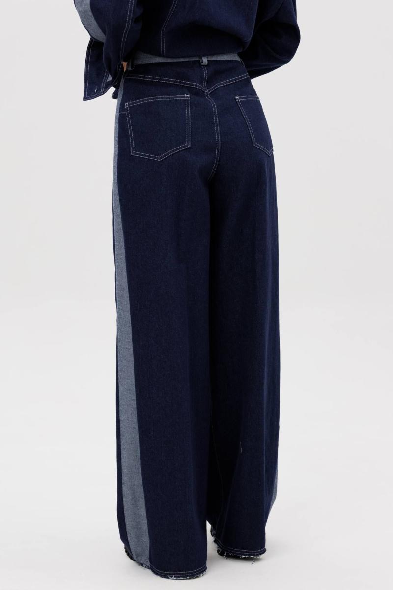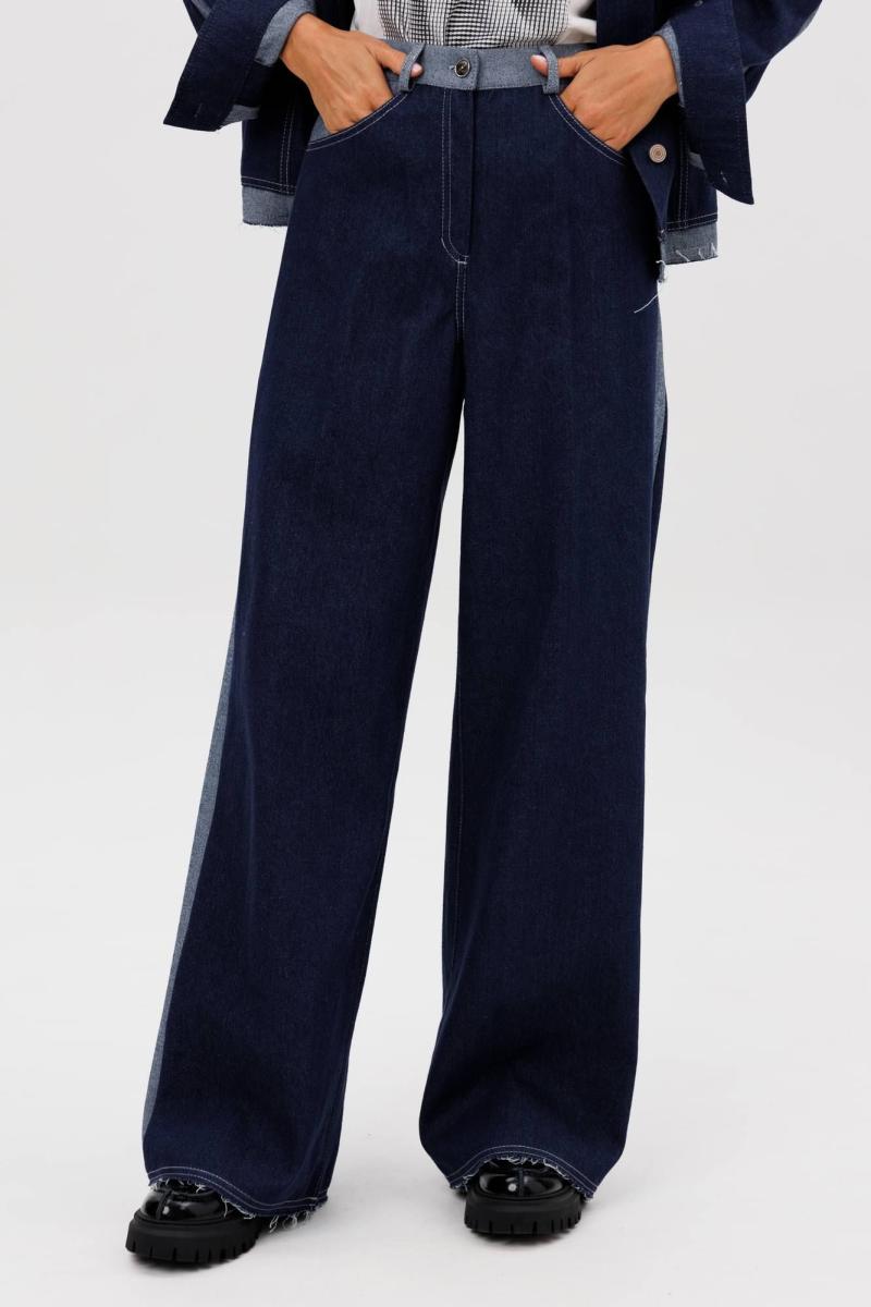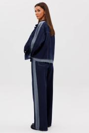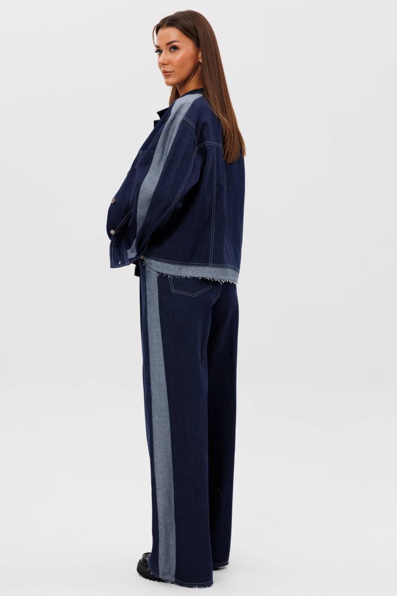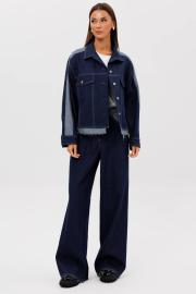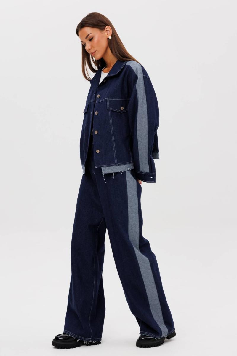 Джинсы классического покроя, свободные, с 5-ю карманами. По боковому шву - лампас из отделочного денима, также в цвет лампаса подзоры боковых карманов и пояс. Низ брюк обработан полоской с открытым срезом. Длина куртки около 52 см.