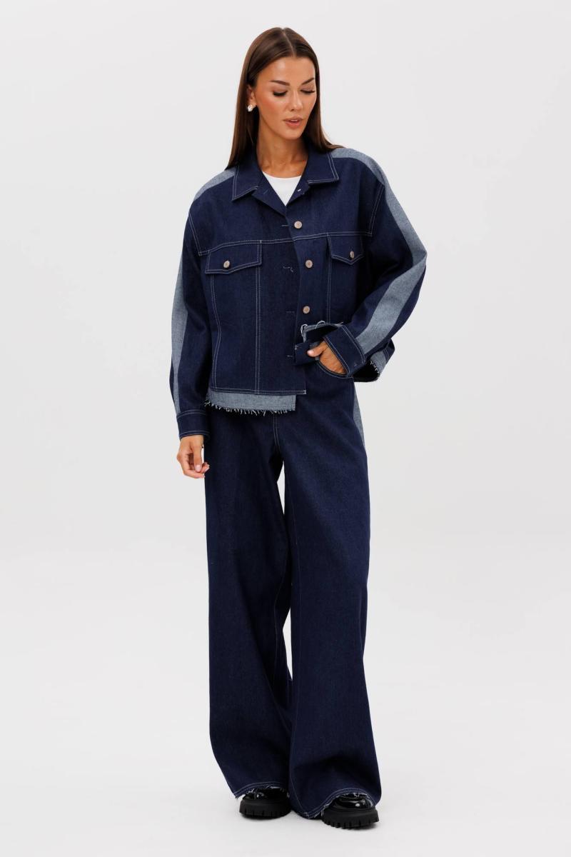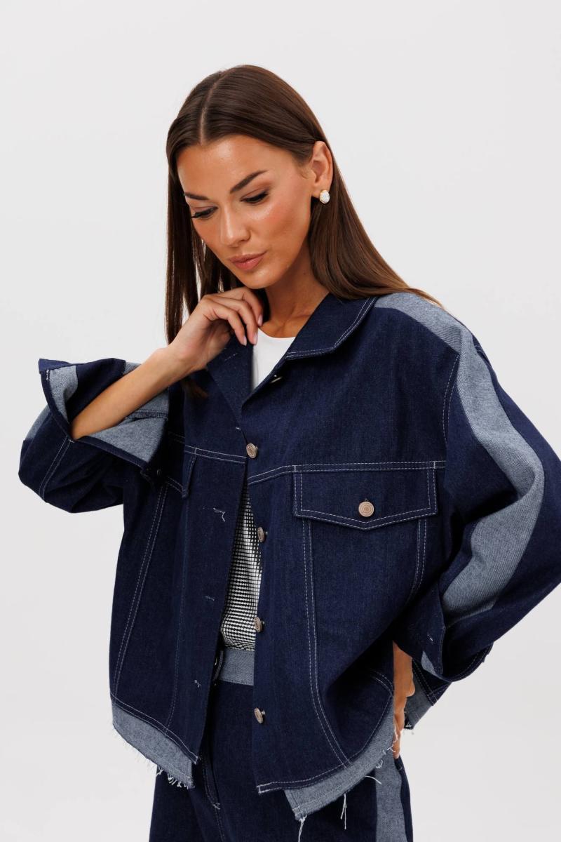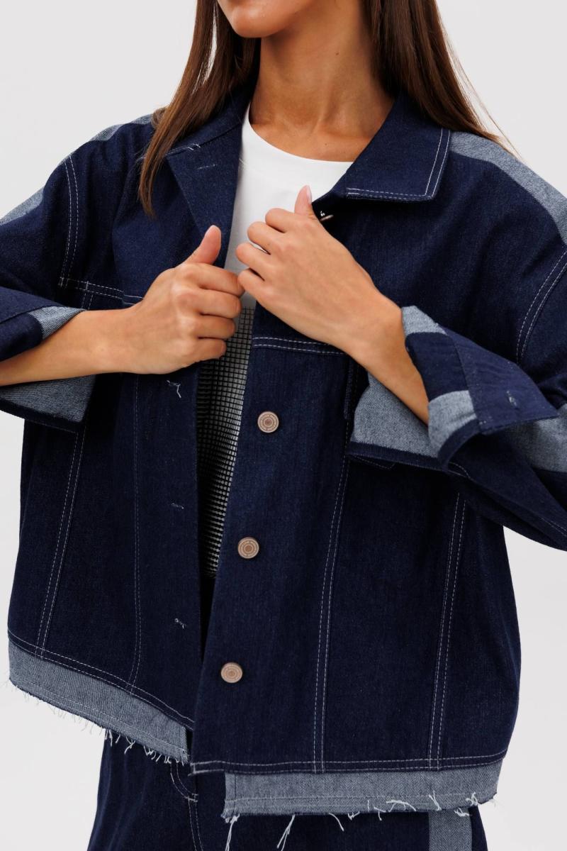 Свободный силуэт, рубашечный покрой, втачной воротник, рукав с притачной манжетой. Полочка с отрезной кокеткой, рельефами и карманом с клапаном. Спинка с отрезной кокеткой и рельефами. Рукав с локтевым швом и разрезом в нём, отделочным лампасом по центру рукава из контрастного денима, мягкой складкой и притачной манжетой. По низу куртки - притачная отделочная полоса в цвет лампаса. Застёжка центральная на петли и пуговицы.