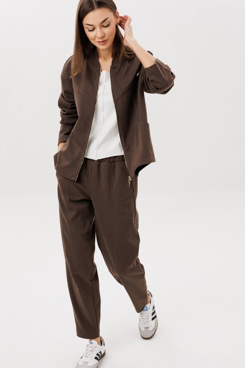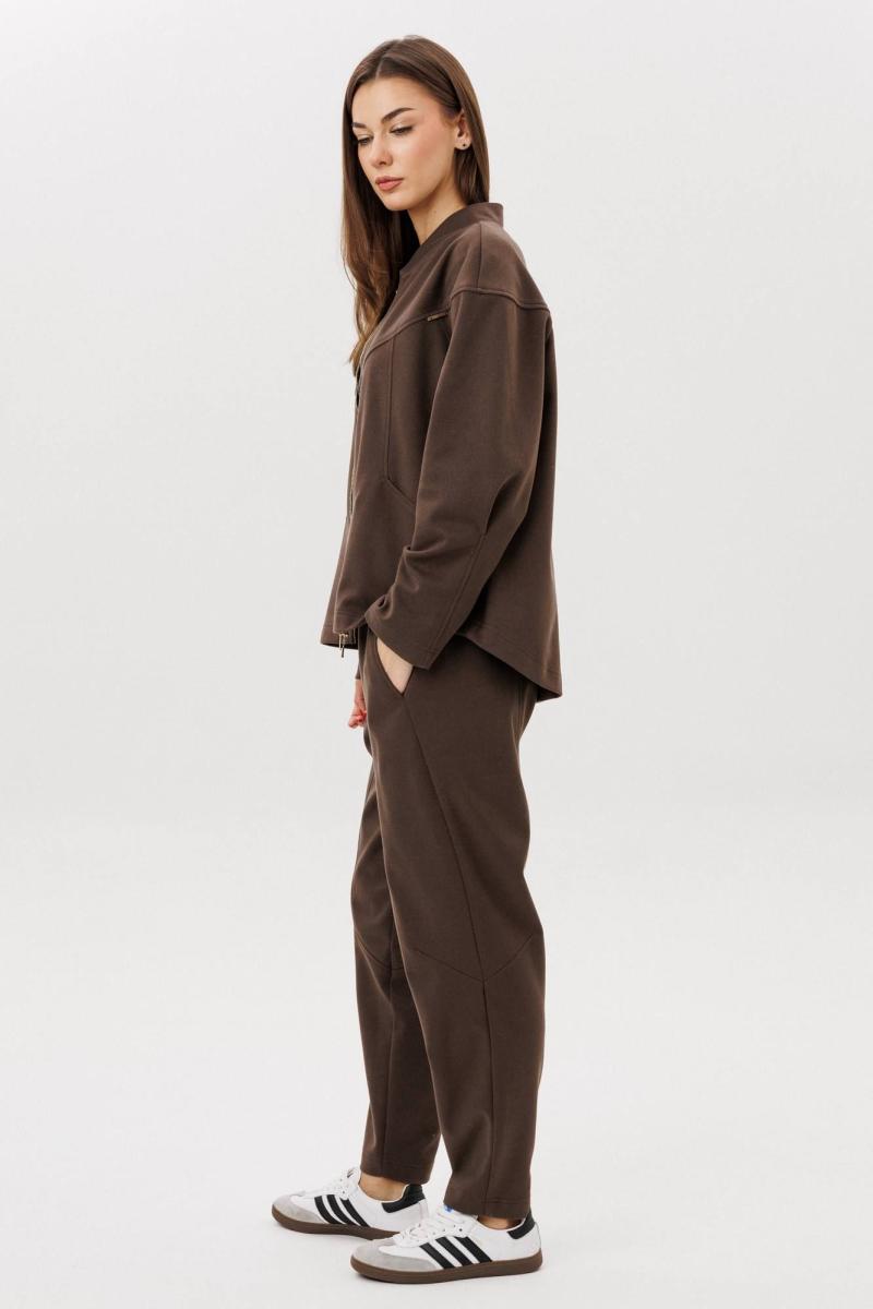 Свободный силуэт, комбинированный покрой, центральная застежка на тесьму-молнию, капюшон рукав-частичный реглан с отрезной широкой манжетой и мягкой складкой в области локтя. Полочка с отрезной кокеткой и фигурным рельефом, переходящим в карман. Спинка с отрезной кокеткой. Брюки свободные, на эластичном поясе в области спинки, с фигурными вертикальными рельефами по центру передних и задних половинок, вытачками в области колена и боковым наклонным карманом. В комплекте топ прилегающего силуэта без рукава.