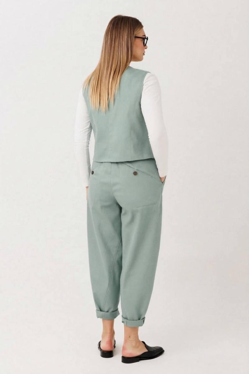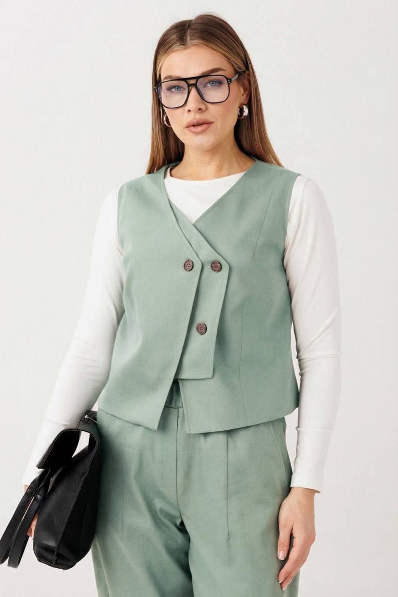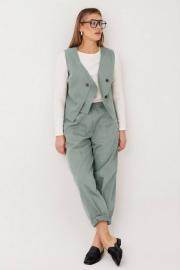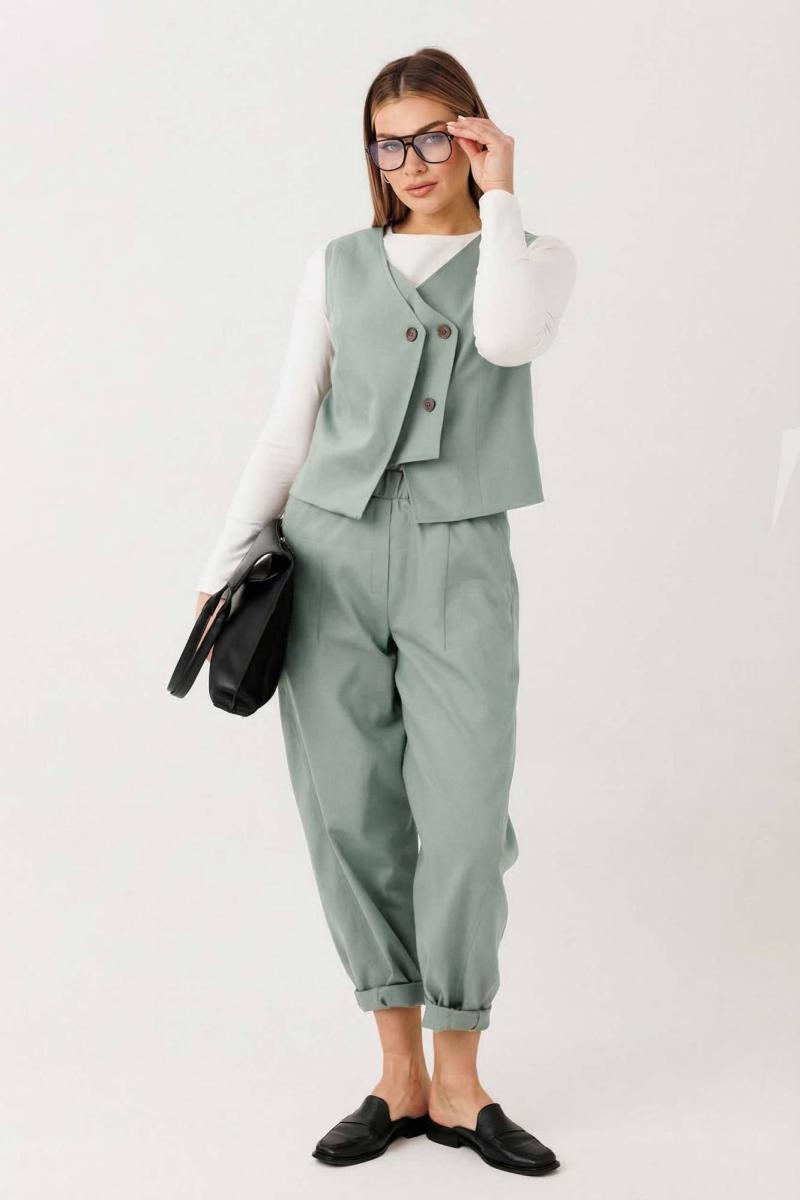 Элегантный брючный комплект в нежном фисташковом оттенке — стильное решение для создания актуального и утончённого образа. Свежий цвет придаёт лёгкость и современное звучание классическому силуэту. В комплект входит: Укороченный жилет с V-образным вырезом и застёжкой на пуговицы Брюки свободного кроя с комфортной посадкой и заужением к низу Жилет подчёркивает линию плеч и добавляет образу структурности, формируя аккуратный и современный силуэт. Он отлично сочетается с базовыми лонгсливами, рубашками или может носиться как самостоятельный элемент. Брюки обеспечивают комфорт и свободу движений благодаря продуманному крою. Лёгкое заужение и укороченная длина делают образ более динамичным и визуально лёгким. Преимущества комплекта: актуальный дизайн с жилетом свежий фисташковый оттенок комфортная посадка универсальность для разных образов Комплект легко адаптируется под разные стили: с лоферами — для сдержанного образа, с кроссовками — для расслабленного casual. Идеальный выбор для тех, кто ценит современную элегантность, комфорт и свежие цветовые решения.