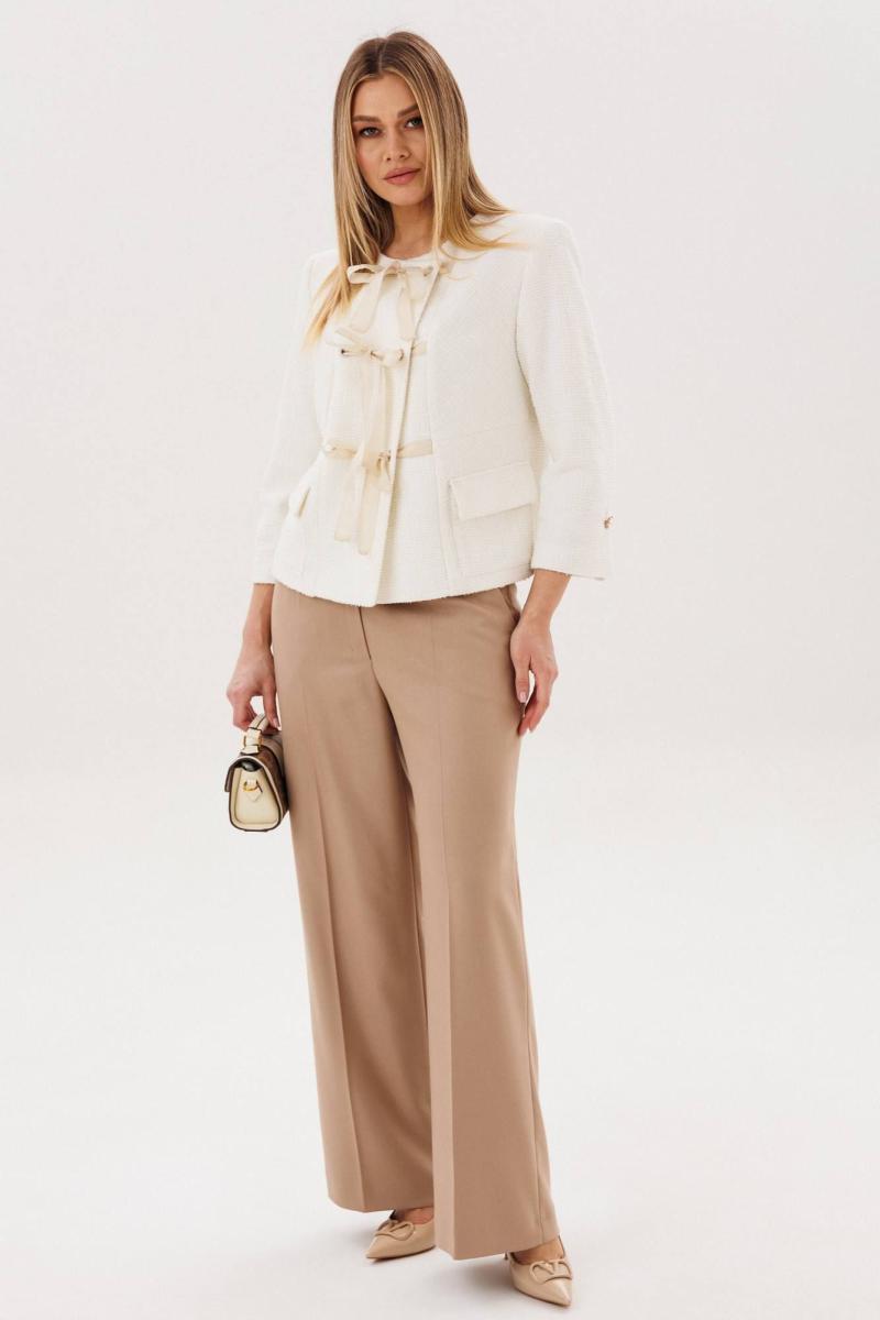 Брюки прямого кроя в благородном бежевом оттенке визуально вытягивают силуэт и создают гармоничное сочетание с жакетом. Комфортная посадка обеспечивает удобство в течение всего дня и делает модель универсальной для разных типов фигуры.
