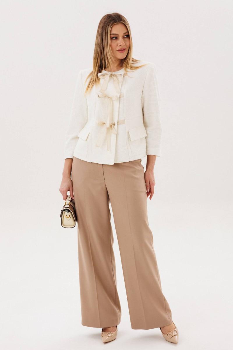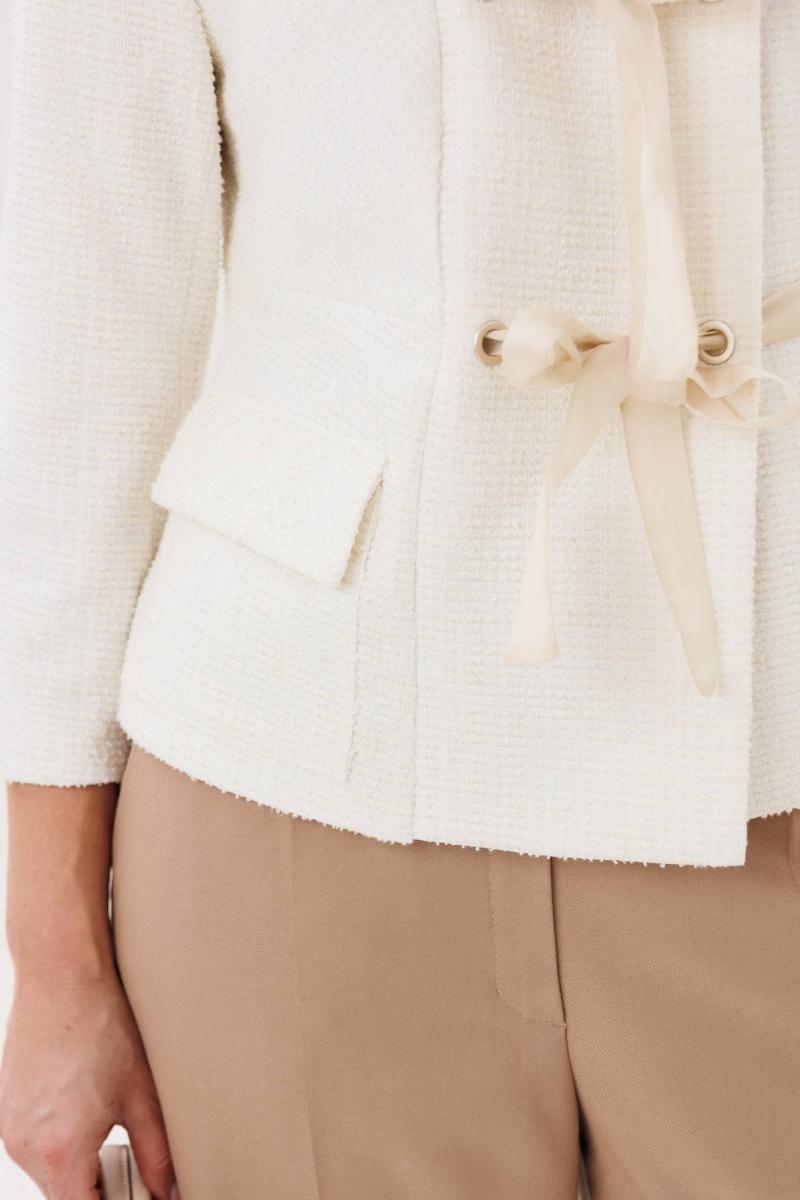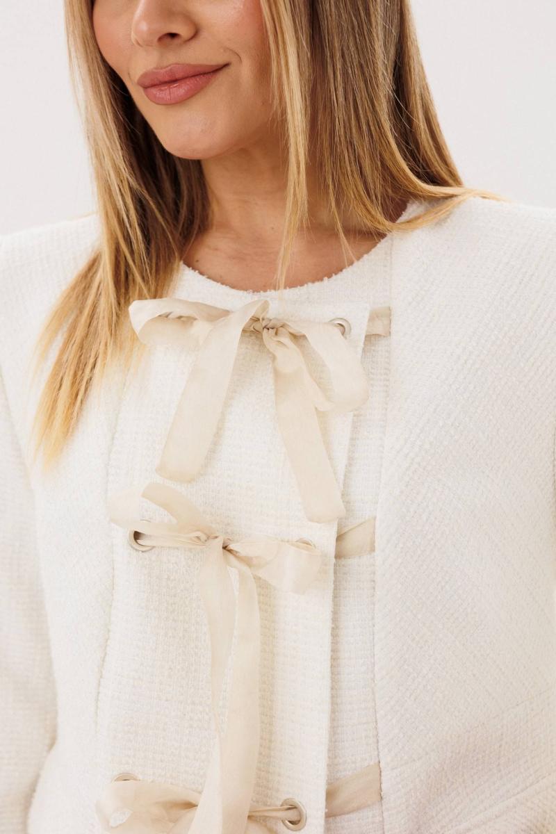 Жакет молочного оттенка выполнен в утончённом стиле и украшен декоративными бантами-завязками, которые придают образу лёгкость и романтичность. Аккуратный крой подчёркивает силуэт, а минималистичные карманы добавляют практичности.