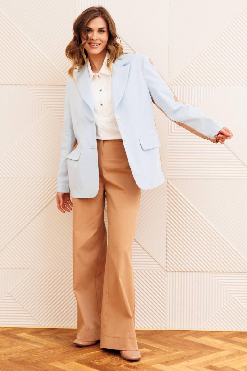 Костюм состоит из жакета и брюк. Жакет прямого силуэта сзади с имитацией куртки выполнен из хлопковой джинсовой ткани. Застежка однобортная на 2 петли и пуговицы. Воротник пиджачного типа. Перед с талиевой вытачкой, рельефом и декоративным клапаном. Спинка скокеткой и складкой. Рукав втачной двухшовный. Низ спинки и нижней части рукава собраны на резинку. Брюки расширеные книзу на притачном поясе. По поясу настрочены шлевки. По передним и задним частям брюк вытачки. На задних частях брюк настрочены карманы. Карманы, вытачки, пояс, низ брюк отделаны отделочной строчкой. Длина жакета - 70 см, длина рукава - 60 см. Длина брюк с учетом пояса -107 см