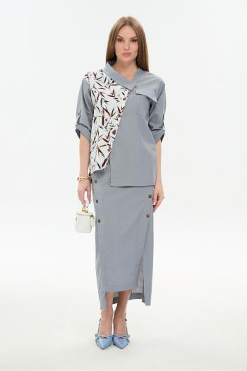 Джемпер прямого силуэта с воротником поло. Рукав втачной одношовный. По низу изделия, по низу рукава и по воротнику проложена отделочная строчка. Брюки расширеные книзу на притачном поясе. по поясу настрочены шлевки. По передним и задним частям брюк вытачки. На задних частях брюк настрочены карманы. Карманы, вытачки, пояс, низ брюк отделаны отделочной строчкой. Длина брюк с учетом пояса - 107см. Длина джемпера- 66 см, длина рукава - 30 см,