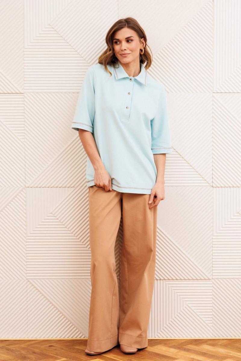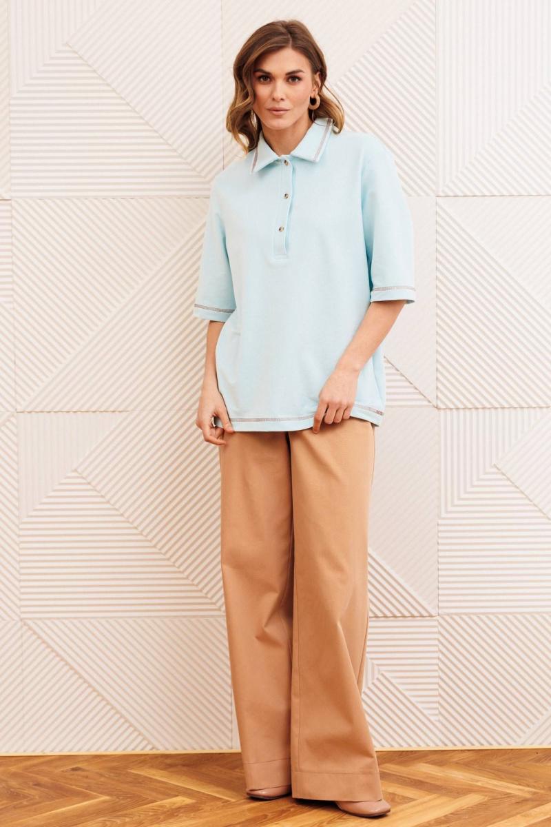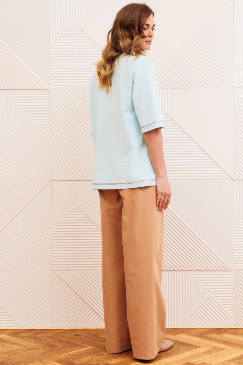 Джемпер прямого силуэта с воротником поло. Рукав втачной одношовный. По низу изделия, по низу рукава и по воротнику проложена отделочная строчка. Брюки расширеные книзу на притачном поясе. По поясу настрочены шлевки. По передним и задним частям брюк вытачки. На задних частях брюк настрочены карманы. Карманы, вытачки, пояс, низ брюк отделаны отделочной строчкой. Длина брюк с учетом пояса - 109 см, длина джемпера- 66 см, длина рукава - 30 см,