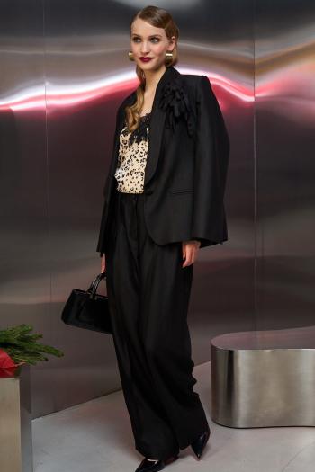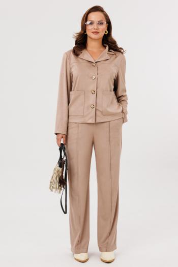 Костюм состоит из блузки и брюк. Блузка оригинальная приталенного силуэта из вельветовой ткани. Перед с подрезом под грудью, сборкой в районе груди и талиевыми вытачками. Затсежка на петли и пуговицы. Горловина V-образной формы. Спинка со средним швом и талиевыми вытачками. Рукав втачной со сборкой по окату и с манжетой по низу. Манжета высокая с двумя петлями и пуговицами. Длина блузки - 63 см, длина рукава блузки - 64 см. Брюки палаццо с притачным поясом из мягкой вельветовой ткани. Спереди застежка гульфик на молнии и петлей и пуговицей по поясу. По задней частям брюк вытачки. Пояс с резинкой в боковых частях. Брюки с заутюженными стрелками. Длина брюк с учетом пояса - 109 см.