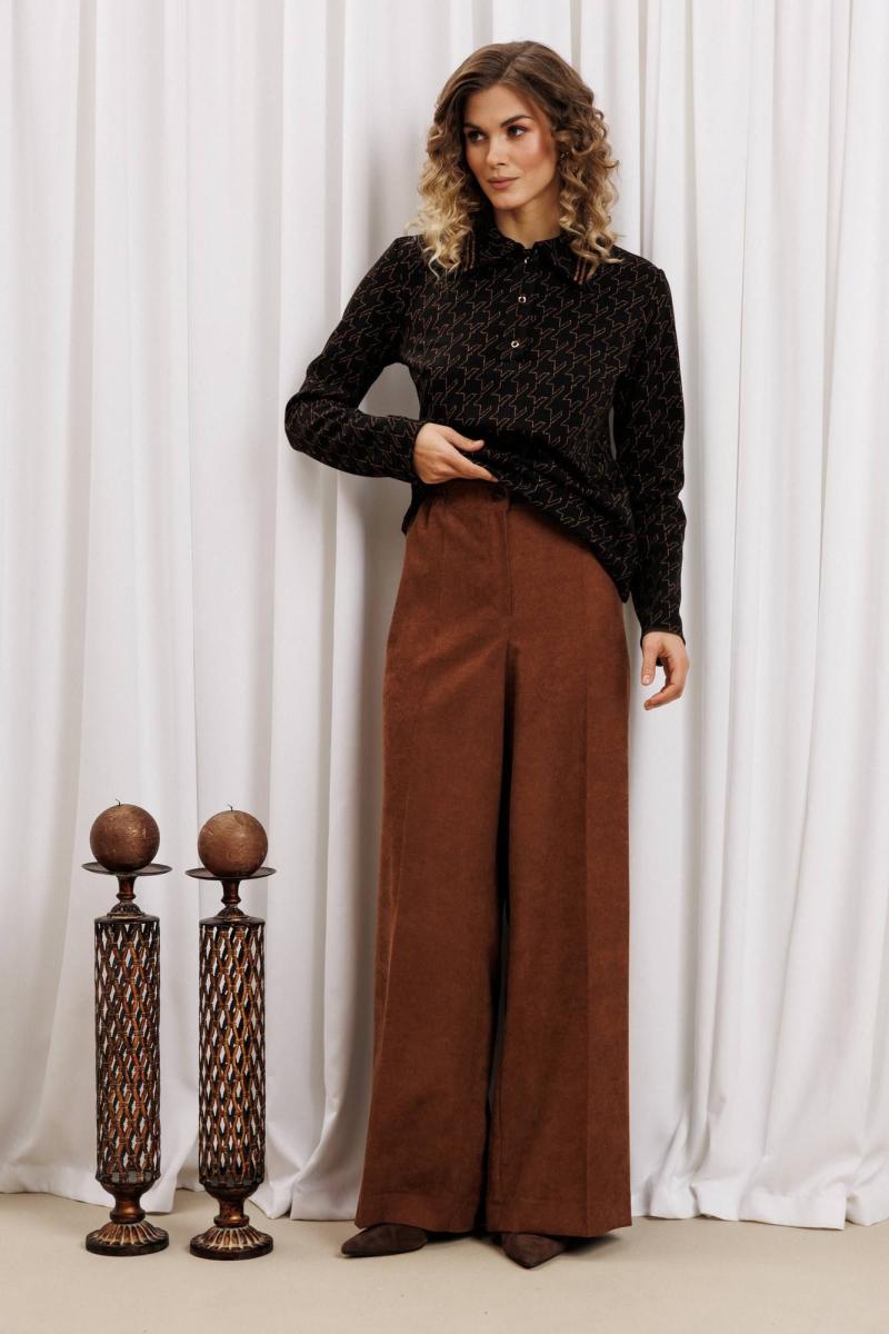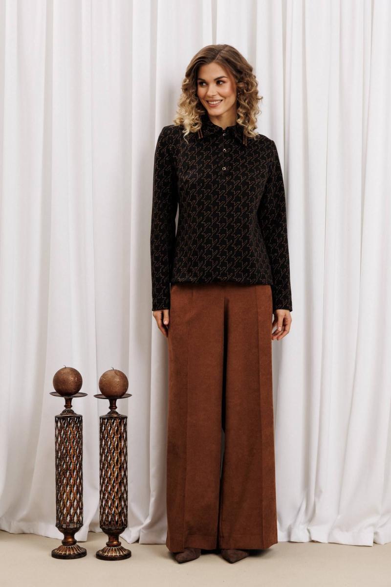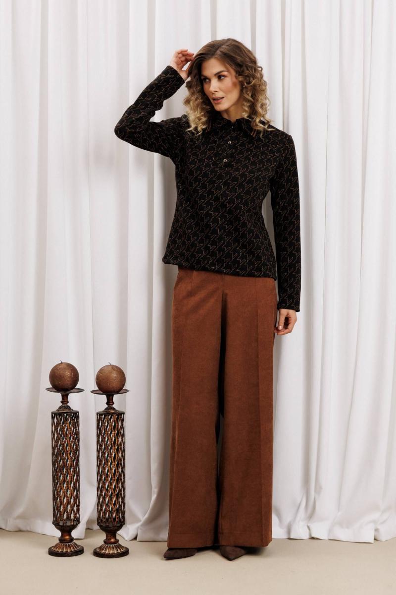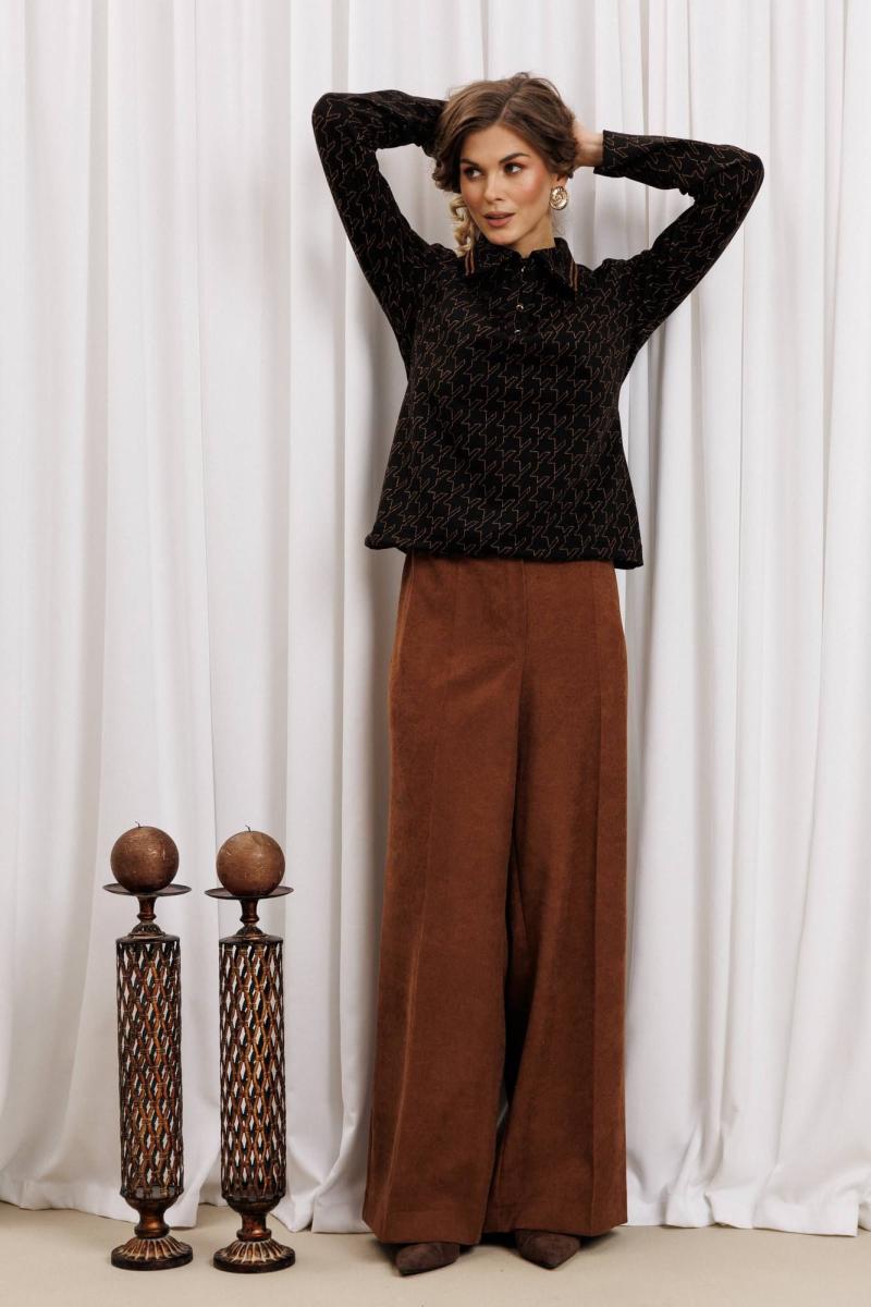 Ксотюм состоит из джемпера и брюк. Джемпер прямого силуэта из плотного трикотажного полотна с оригинальным рисунком из люрекса. Перед с застежкой поло и нагрудными вытачками. По воротнику настрочена декоративная тесьма. Длина джемпера - 60 см, длина рукава - 61 см. Брюки палаццо с притачным поясом из мягкой вельветовой ткани. Спереди застежка гульфик на молнии и петлей и пуговицей по поясу. По задней частям брюк вытачки. Пояс с резинкой в боковых частях. Брюки с заутюженными стрелками. Длина брюк с учетом пояса - 109 см.