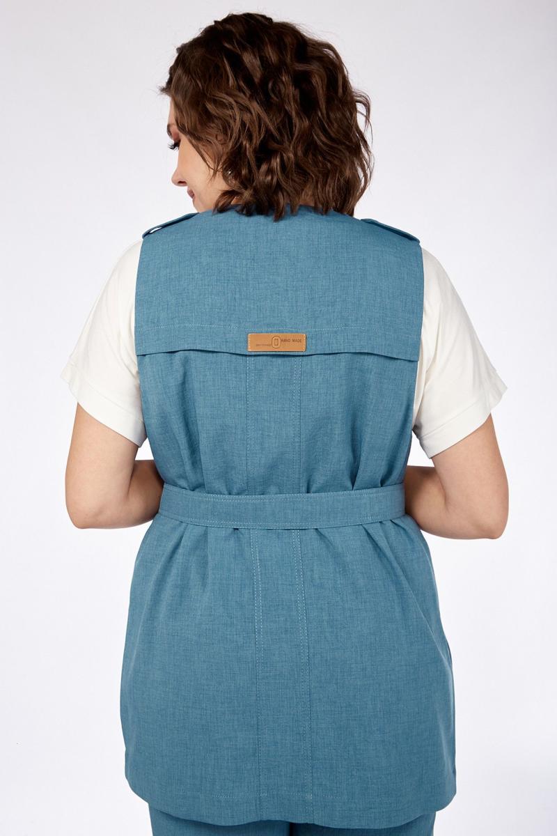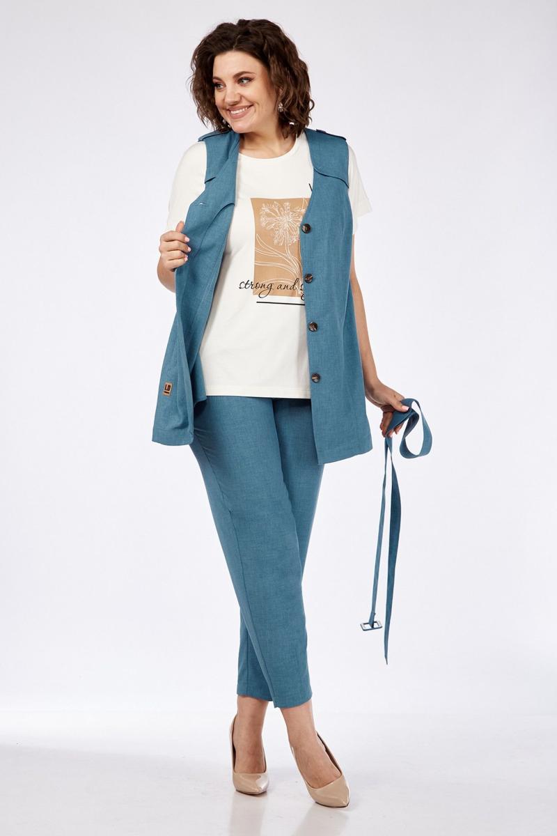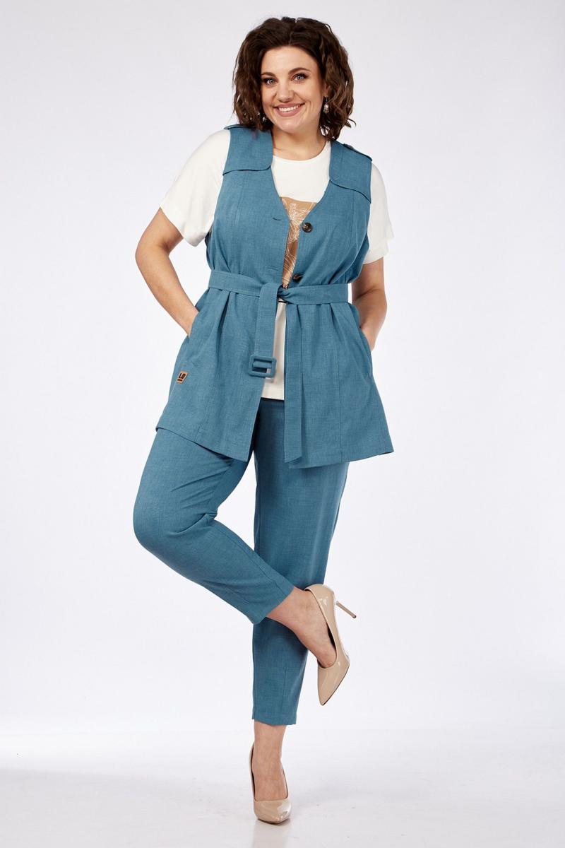 Комплект брючный 3-х предметный состоит из жилета, брюк и джемпера. Жилет из костюмно-плательной ткани прямого силуэта. Горловина V-образной формы. По переду фигурные кокетки, рельефные швы. Застежка центрально — бортовая на петли и пуговицы. Спинка разрезная с кокеткой. По боковым швам разрезы. На плечевых швах паты с пуговицей. Брюки средней посадки, заужены к низу. По переду боковые карманы с подрезным бочком. По задним деталям накладные карманы. Пояс в 58-62 размере частично на резинке. Джемпер из трикотажного полотна. Рукав спущенный. По переду печать.