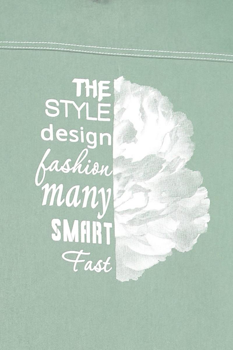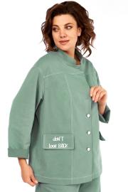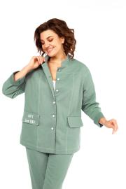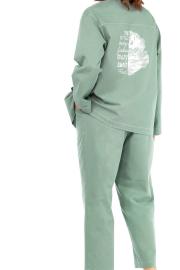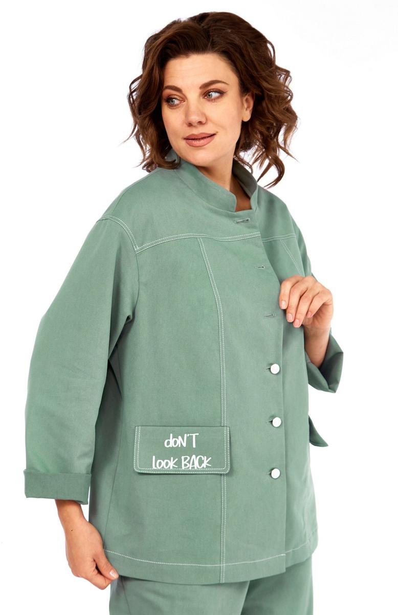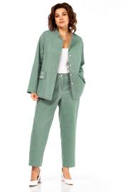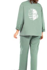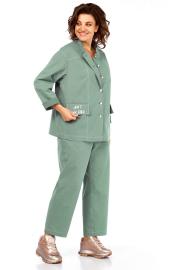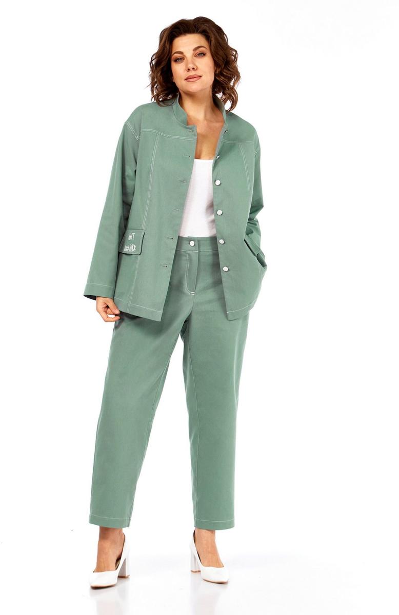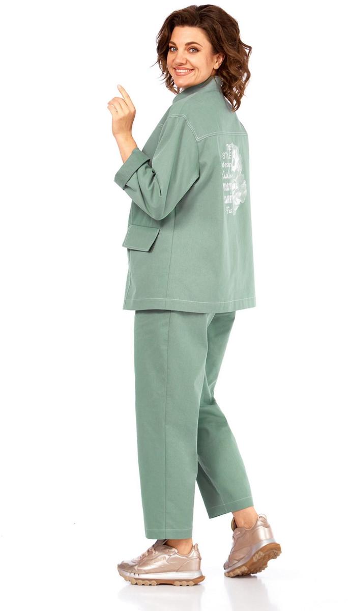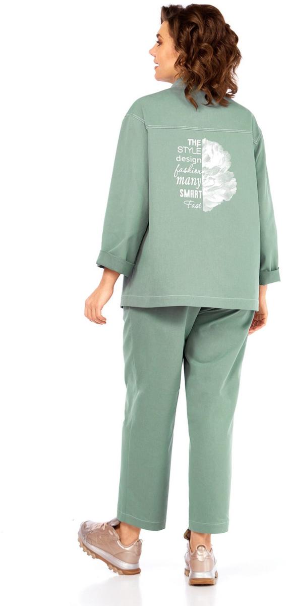 Костюм брючный двухпредметный, состоит из жакета и брюк, выполнен из ткани костюмно-плательного ассортимента. Жакет прямого силуэта. Горловина обработана воротником — стойка, застежка центрально — бортовая на петли и пробивные пуговицы. Перед с кокетками и рельефами выходящими из них. Имеются прорезные карманы с клапаном. Спинка на кокетке. Рукава рубашечного типа. Жакет дополнен печатью. Брюки свободного силуэта слегка заужены к низу. Пояс притачной, частично на эластичной тесьме, с застежкой на петлю и пробивную пуговицу. По переду обработаны карманы с листочкой и подрезным бочком. Вдоль швов костюма проходят контрастные строчки из отделочных ниток.