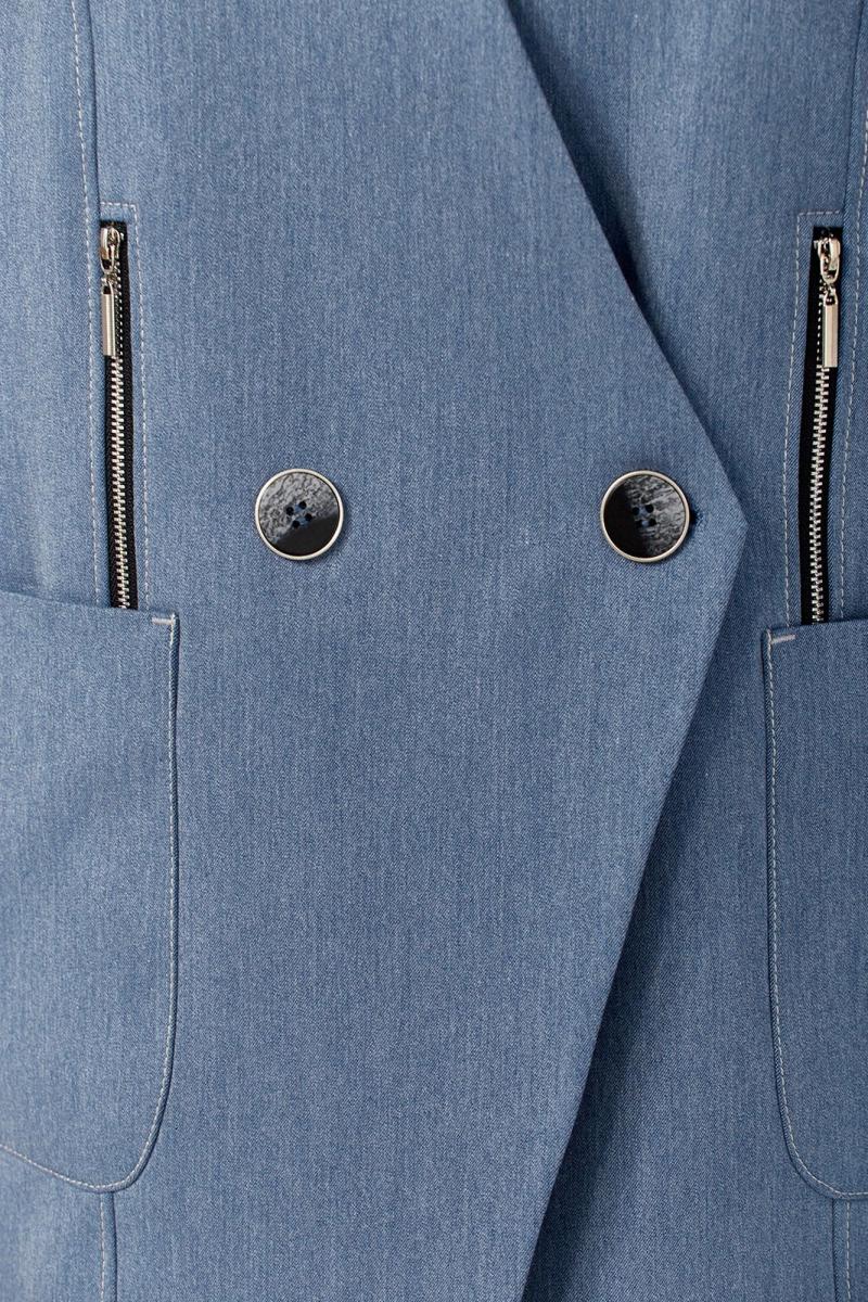 Костюм брючный 3х — предметный, состоит из жилета, лонгслива и брюк. Жилет и брюки выполнены из костюмной ткани, лонгслив из трикотажного вискозного полотна. Жилет прямого силуэта с двубортной застежкой на петлю и пуговицу. Горловина V-образной формы. По переду обработаны накладные карманы, в рельефах декоративные элементы с молниями. Спинка с фигурной кокеткой. Брюки свободного силуэта, с притачным поясом и вставками эластичной тесьмы. Застежка на петлю и пуговицу. В передних деталях брюк обработаны карманы с подрезным бочком. Лонгслив прямого силуэта, перед и спинка цельнокроеные, рукава втачные. Горловина обработана бейкой.