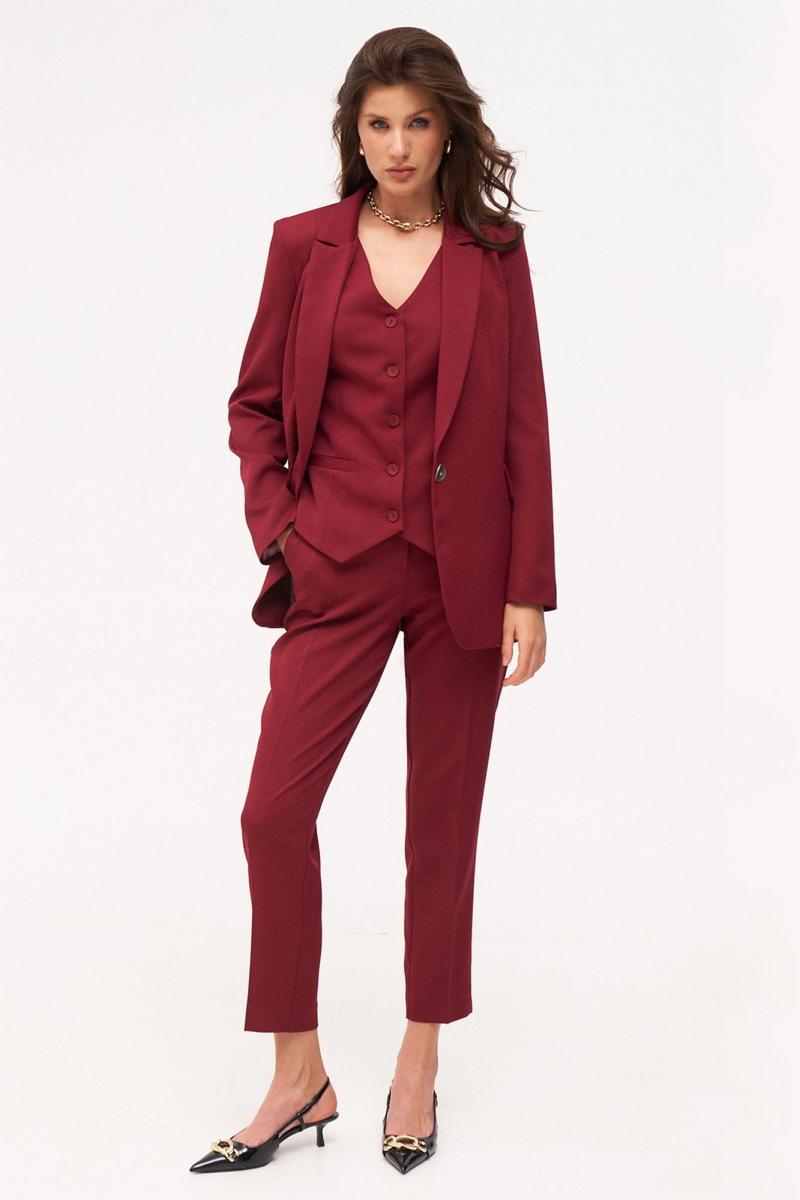 Шикарный 2-х предметный комплект, состоящий из жакета и брюк. Универсальный женский жакет на подкладке прямого силуэта. Перед с центральной застежкой на одну пуговицу, с карманами и с клапанами в шве. Воротник стояче-отложной втачной с отворотом лацкана. Рукав двухшовный, втачной.Брюки базовые со стрелками. Изделие имеет комфортную средней посадку. Брюки на притачном поясе со шлёвками. Спереди боковые функциональные карманы, сзади имитация прорезных карманов с листочкой. Длина жакета - 73 см, длина рукава – 63 см, длина брюк по боковому шву с поясом - 98 см.