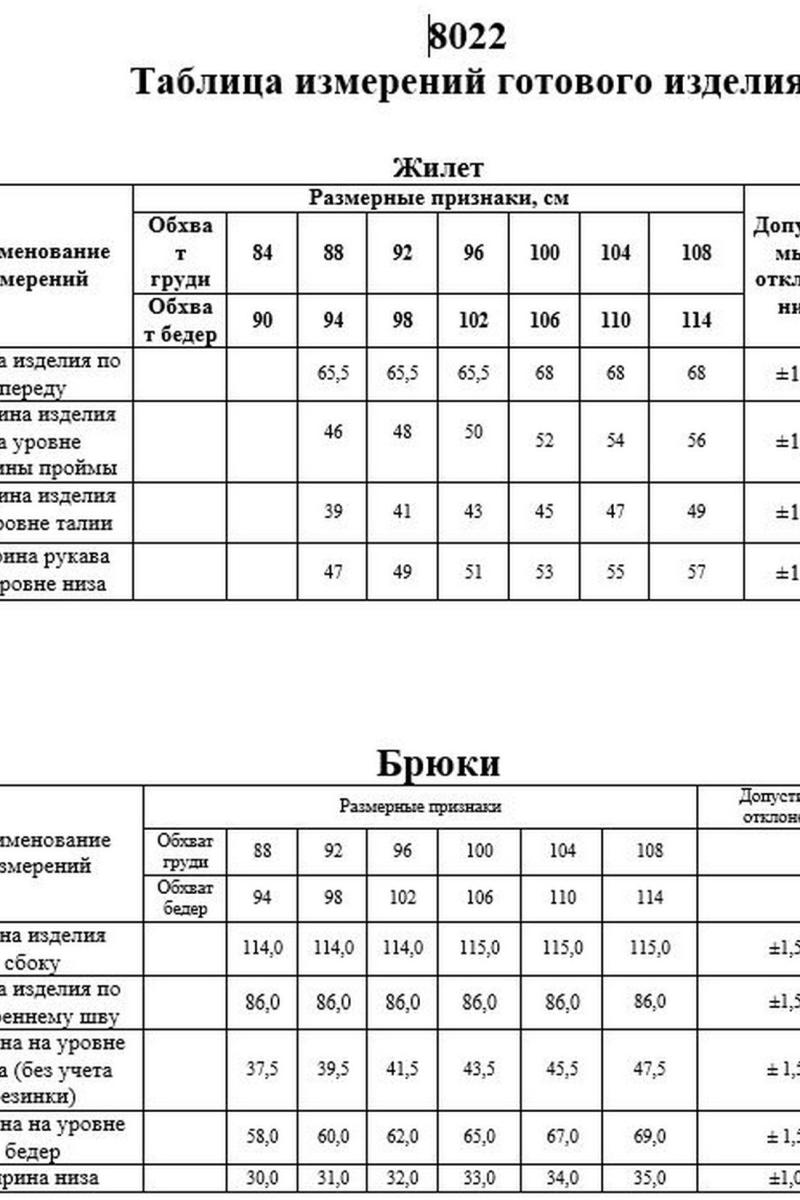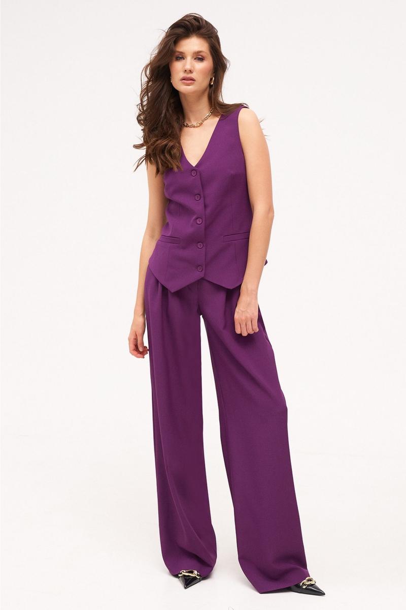 Спинка с талиевыми вытачками. Жилетка на притачной подкладке. Застежка центральная, на прорезные петли и пуговицы. Длина жилетки до уровня линии бедер. Брюки женские большого объема, прямого силуэта, вида «палаццо». На передних половинках брюк по линии талии заложены две