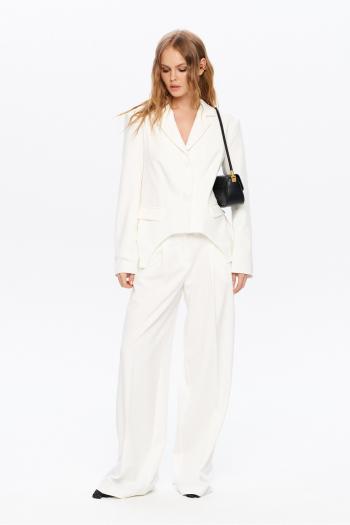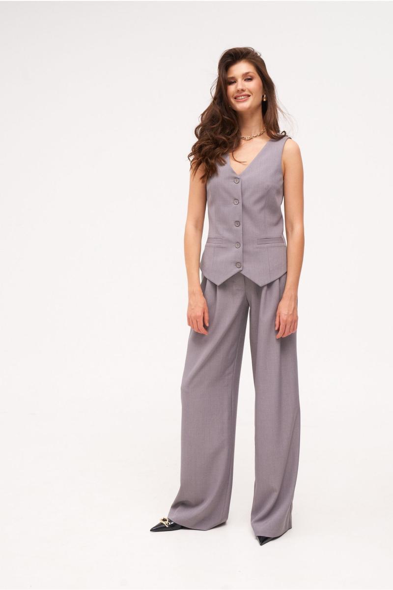 Женский костюм 2-ка состоящий из жилетки и брюк. Жилетка женская умеренного объема полуприлегающего силуэта. Перед с талиевыми вытачками и имитацией карманов с листочкой. Спинка с талиевыми вытачками. Жилетка на притачной подкладке. Застежка центральная, на прорезные петли и пуговицы. Длина жилетки до уровня линии бедер. Брюки женские большого объема, прямого силуэта, вида «палаццо». На передних половинках брюк по линии талии заложены две односторонние складки, направленные в сторону бокового шва и функциональные карманы с отрезным бочком. На задних половинках находятся по две талиевые вытачки. Пояс отрезной, притачной, с уступом на правой передней половинке. На поясе шлевки. Верхний край пояса расположен на естественной линии талии. Застежка брюк – классический гульфик. Застежка пояса на две пуговицы и две петли. Длина брюк в пол.