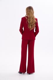 Костюм состоящий из приталенного жакета и брюк. Силуэтный жакет с воротником-стойком плавно переходящим в борта. Застёжка на ряд пуговиц. По переду прорезные карманы в рамку. Рукава со шлицами и пуговицами. Брюки классической посадки с карманами по бокам. По силуэту слегка расклешены.