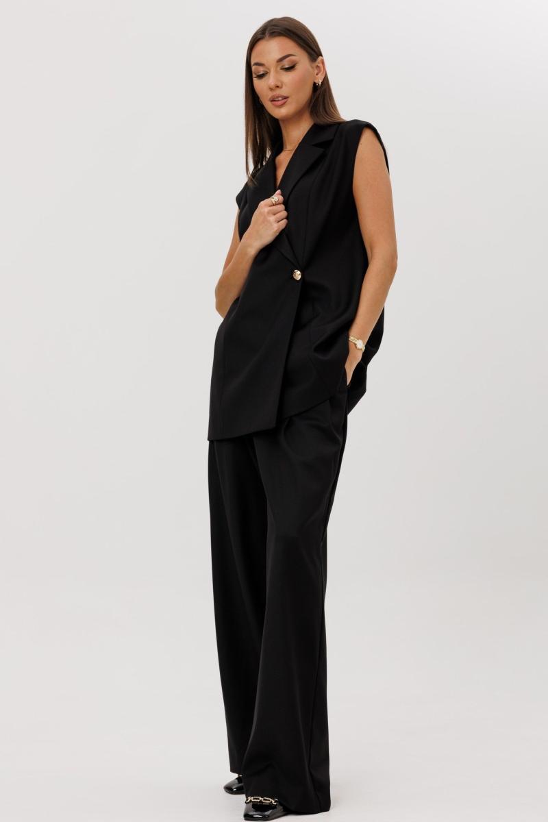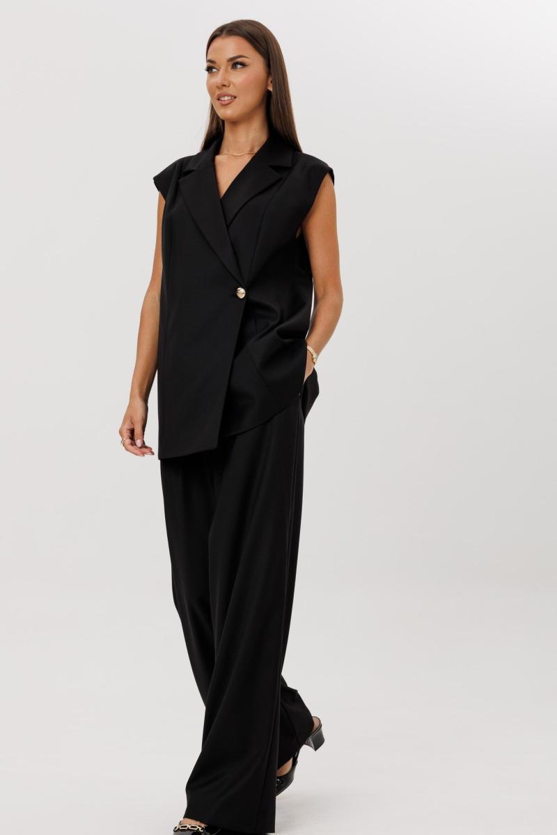 Стильный гармоничный комплект, состоящий из двубортного жилета и свободных брюк в стиле палаццо. Жилет двубортный прямого свободного силуэта в стиле oversize на подкладке. Линия плеча слегка спущена 16 см. Изделие состоит из вертикальных рельефных деталей на полочке и спинке. Горловина оформлена английским отложным воротником с лацканами, застежка двубортная фронтальная петли/пуговицы в области чуть выше линии талии. Длина изделия по среднему шву спинки 73-75 см (в зависимости от размерного ряда). Брюки комплекта созданы в свободном стиле палаццо. В пояс брюк по спинке вставлена эластичная тесьма, шириной 3 см. Спереди пояс фиксируется горизонтально на петли/пуговицы и вертикалную закрытую клапан-молнию (гульфик). При желании в пояс можно вставить ремень, так как имеются шлевочные держатели. В боковых швах: карманы с наклонным входом, на поясной линии талии расположены две неглубокие складки для свободы движения. Длина брюк по боковому шву 105-107 см (в зависимости от размерного ряда). (фурнитура может отличаться от представленной на рекламном фотоматериале) Особые рекомендации: рекомендуется холодная деликатная ручная стирка, без использования отбеливающих СМС, без интенсивного трения. Сушка в вертикальном положении. ВТО с минимальным паром.