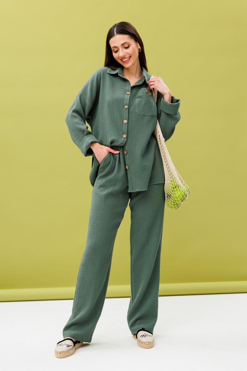 Стильный комплект, состоящий из блузы рубашечного силуэта и свободных брюк.