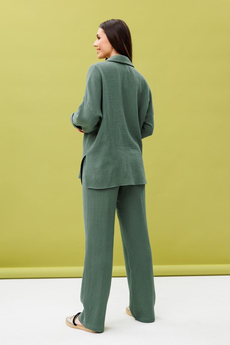Брюки комплекта прямого силуэта. В боковых швах расположены внутренние наклонные карманы. Пояс со вставленной эластичной тесьмой, шириной 4,5 см. Длина брюк по боковому шву 104 см (не считая высоты пояса 4,5 см).