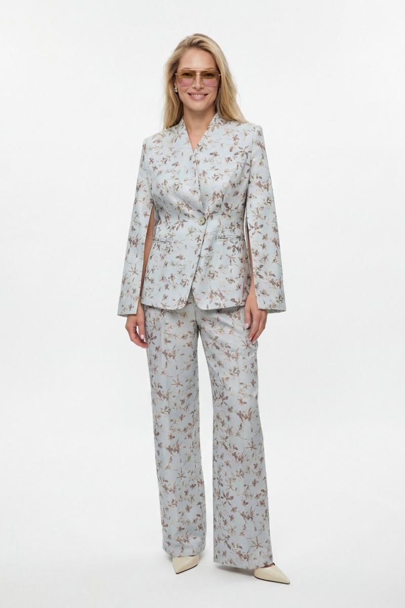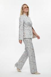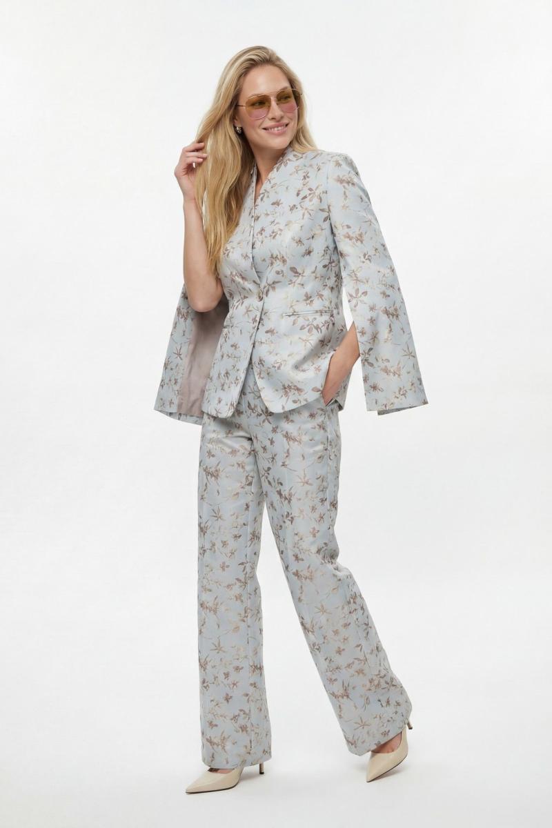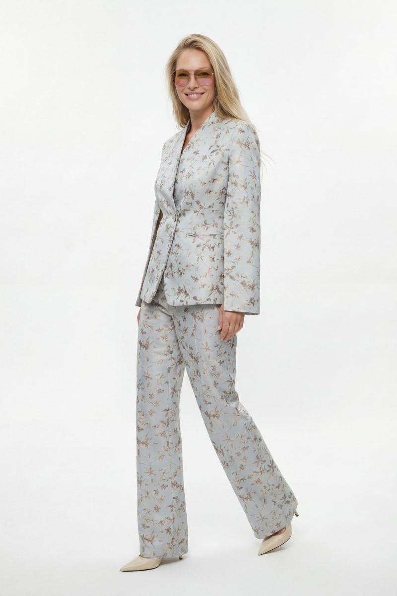 Костюм брючный, выполнен из плательно-костюмной ткани. Жакет полуприлегающего силуэта на подкладке, застежка на одну петлю и пуговицу. Рукав втачной длинный, по шву разрезы. На шлице рукава пуговица. Воротник стойка. Низ борта закругленный. По бокам прорезные карманы в рамку. По спинке средний шов, переходящий в отлетную шлицу, и рельефы. Брюки на притачном поясе с резинкой по спинке, застёжка на молнию и петлю-пуговицу. В боковых швах прорезные карманы. Брюки свободного кроя, прямого силуэта, на притачном поясе. По переду глубокие складки, в боковых швах прорезные карманы. По задней половине брюк талевые вытачки.