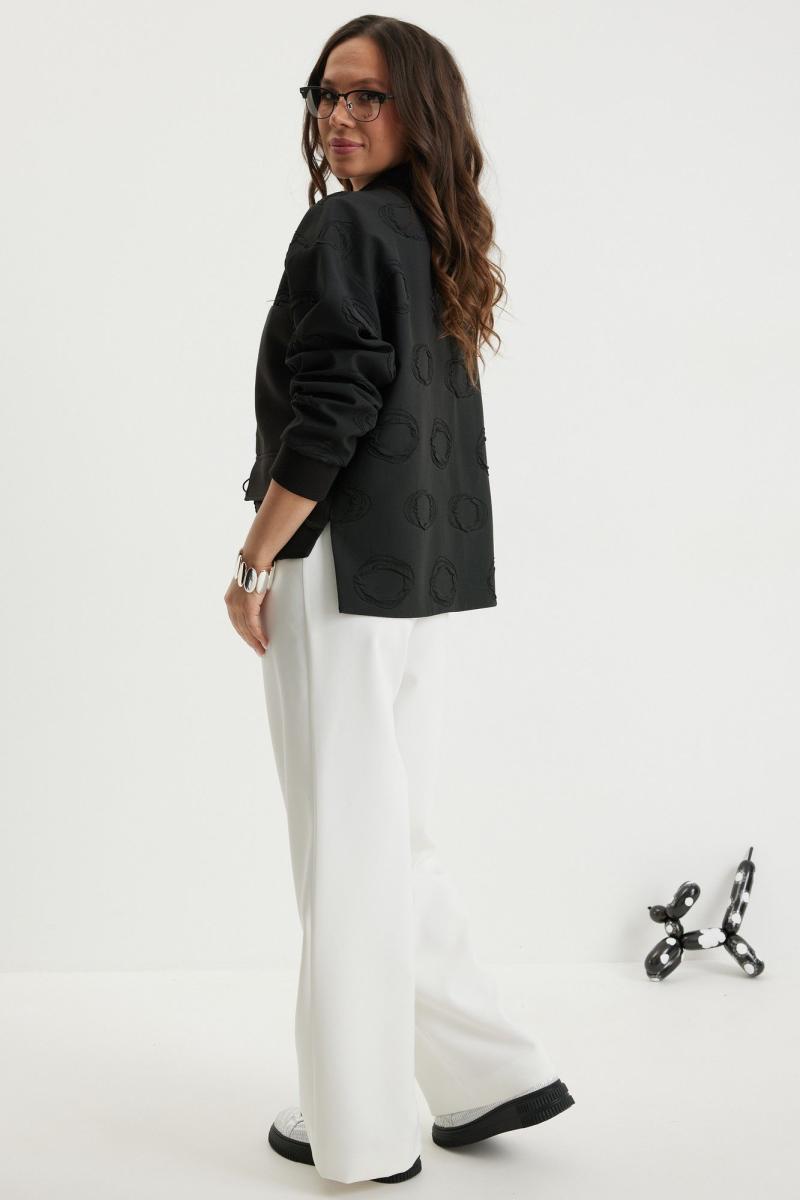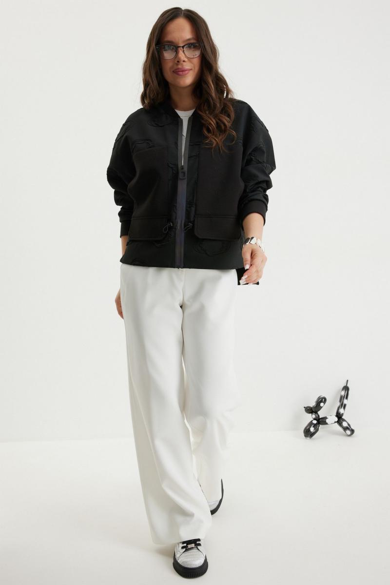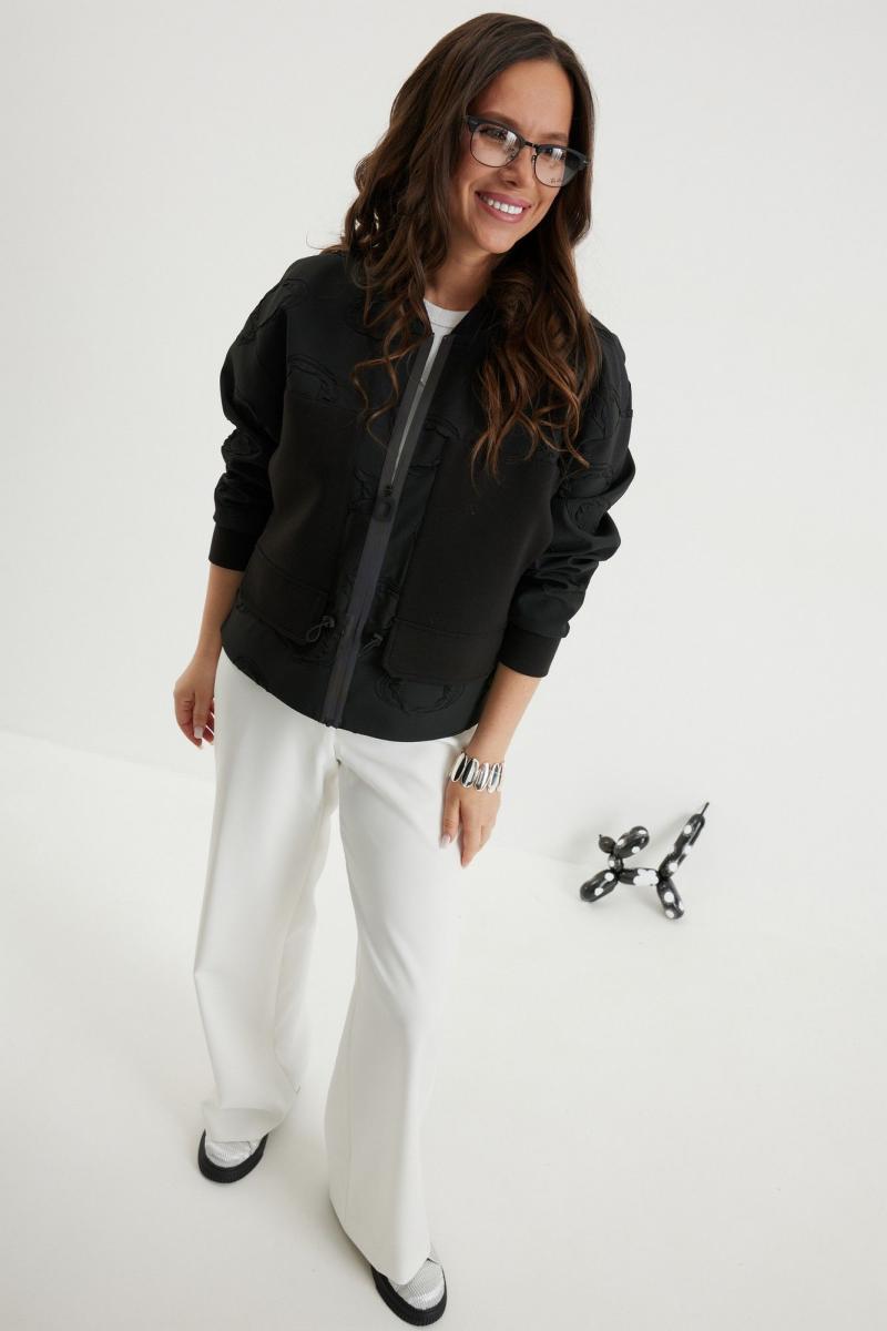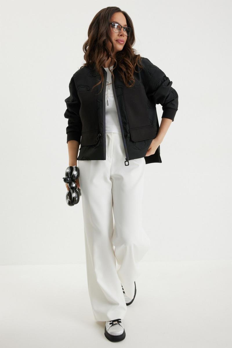 Стильный комплект из бомбера и брюк. Бомбер свободного кроя с центральной застежкой на красивую молнию. Выполнен из фактурного жаккардового полотна на подкладке. Дополнен удобными боковыми карманами. Рукав полной длины, слегка спущен, присборен по низу на эластичную тесьму. Брюки прямого классического кроя, с притачным поясом, дополненным эластичной тесьмой. Застежка гульфик на молнию и пуговицу. Брюки дополнены комфортной подкладкой телесного цвета, что исключает просвечивание белья и фактуры кожи. Длина бомбера по спинке 70см., по переду 66см., Длина рукава60см. Длина брюк по боковому шву 104 см.