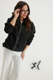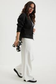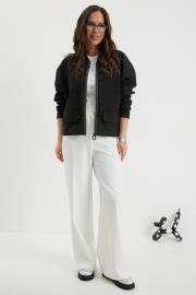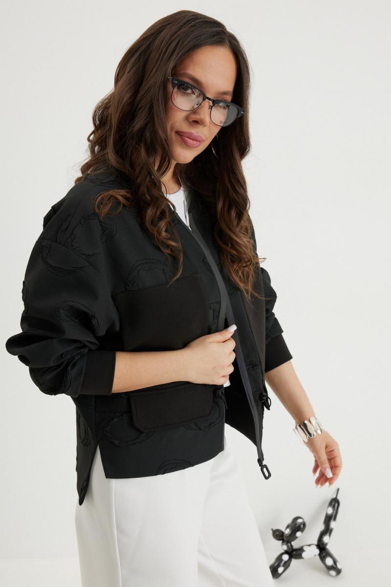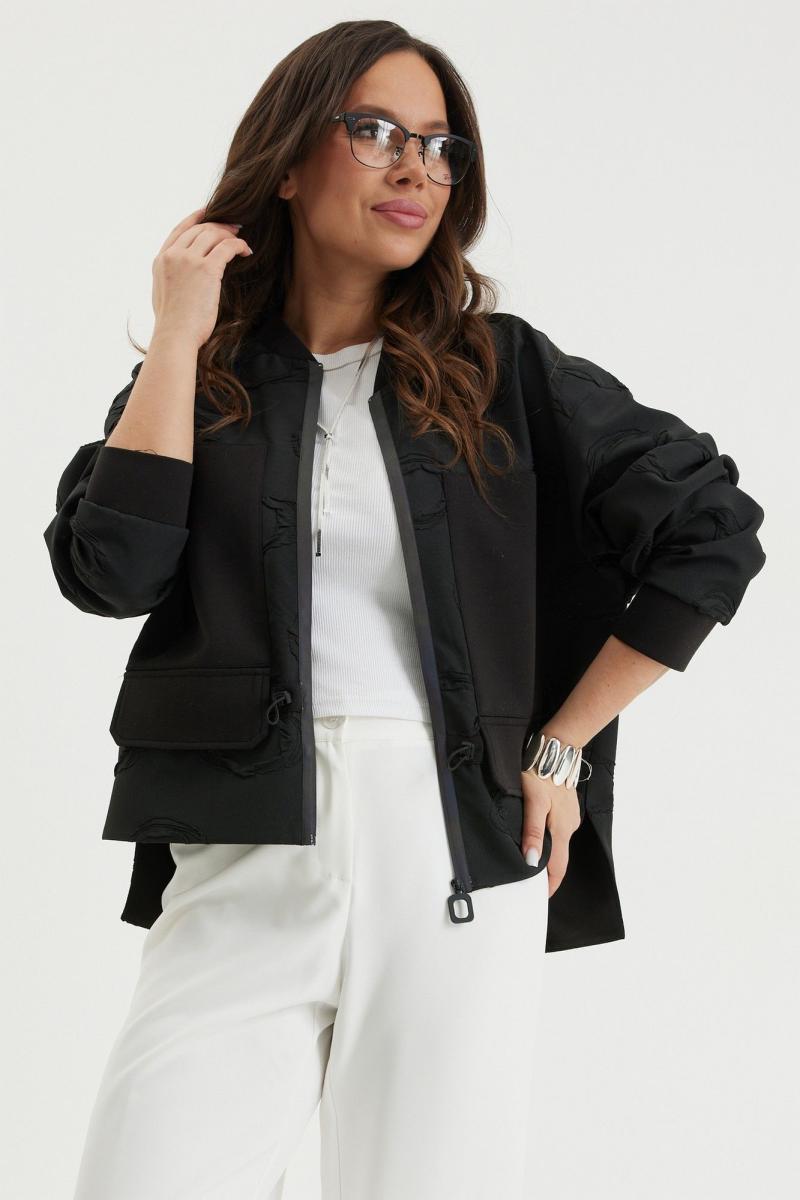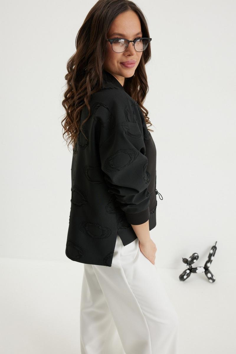 Стильный комплект из бомбера и брюк. Бомбер свободного кроя с центральной застежкой на красивую молнию. Выполнен из фактурного жаккардового полотна на подкладке. Дополнен удобными боковыми карманами. Рукав полной длины, слегка спущен, присборен по низу на эластичную тесьму. Брюки прямого классического кроя, с притачным поясом, дополненным эластичной тесьмой. Застежка гульфик на молнию и пуговицу. Брюки дополнены комфортной подкладкой телесного цвета, что исключает просвечивание белья и фактуры кожи. Длина бомбера по спинке 70см., по переду 66см., Длина рукава60см. Длина брюк по боковому шву 104 см.