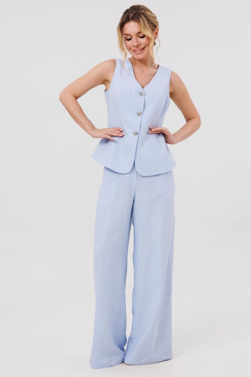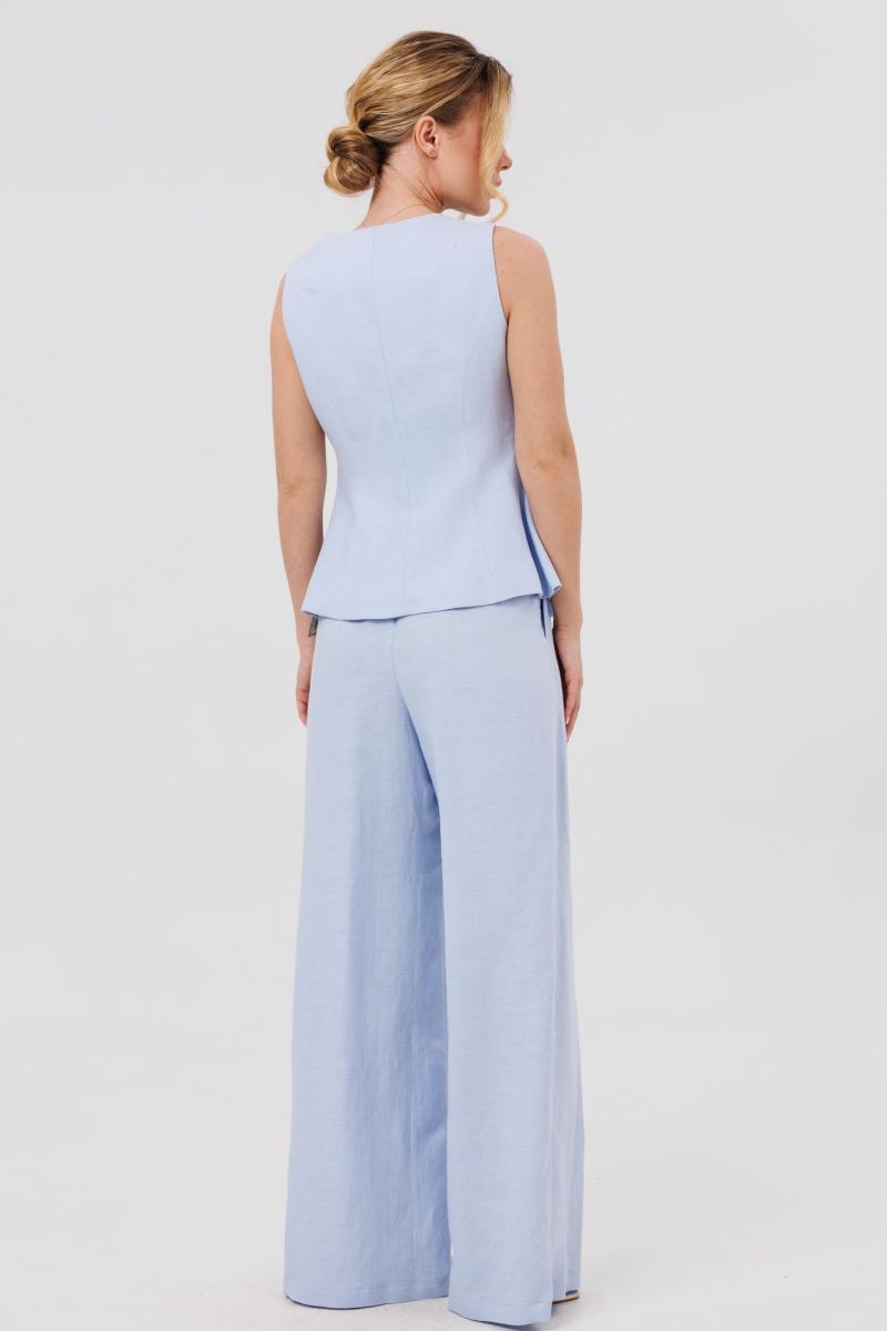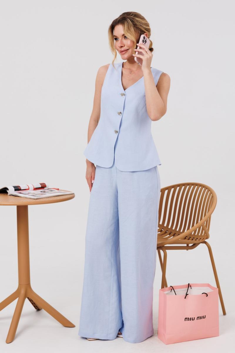 Изделие из льна с вискозой. Жилетка малого обьема, расштрение идет от талии к низу. Красивые пуговицы делаеют его нарядным. Брюки палацо, На притачном поясе, сзади резинка.