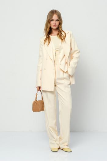 Трех-предметный, женский комплект, состоит из брюк, трикотажной майки и блузы. Майка выполнена из 100% хлопковой ткани, горловина обработана бейкой, на полочке выполнена аппликация шнуром. Рукав укороченный. Блуза выполнена из ткани с натуральным составом, немного тянеться, на полочке обработаны выточки, по линии талии отрезной пояс со сборкой и кулисой, накладной карман. Горловина обработана притачной бейкой. Рукав оптимальной длины ¾, по низу притачная манжета. Спинка также отрезная по линии талии, с присборенной деталью. Брюки выполнены из той же ткани, что и блуза, верхний срез обработан поясом на резинке, по переду застежка на молнию, в бокоых швах обработаны карманы. Комплект выполненный из натуральных тканей- отличный выбор для летнего гардероба!