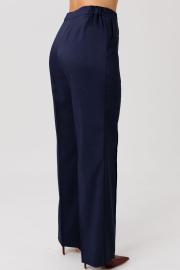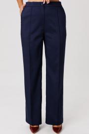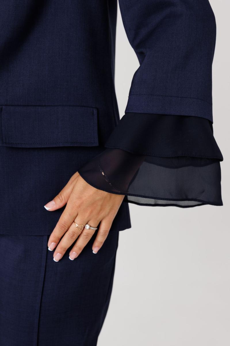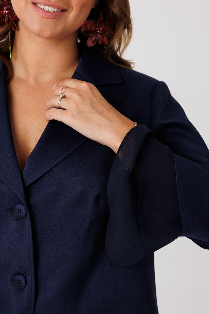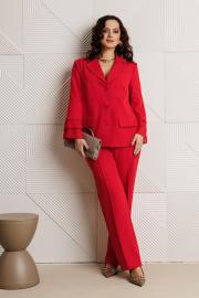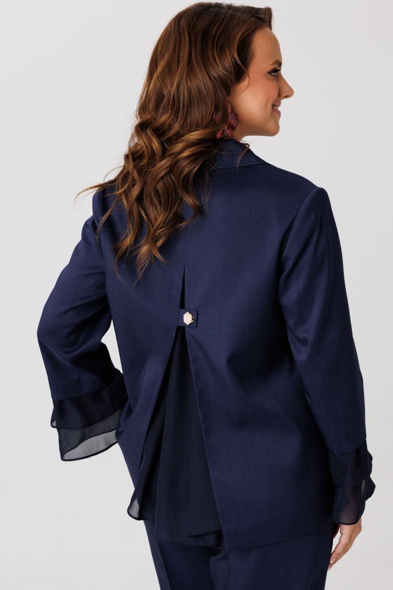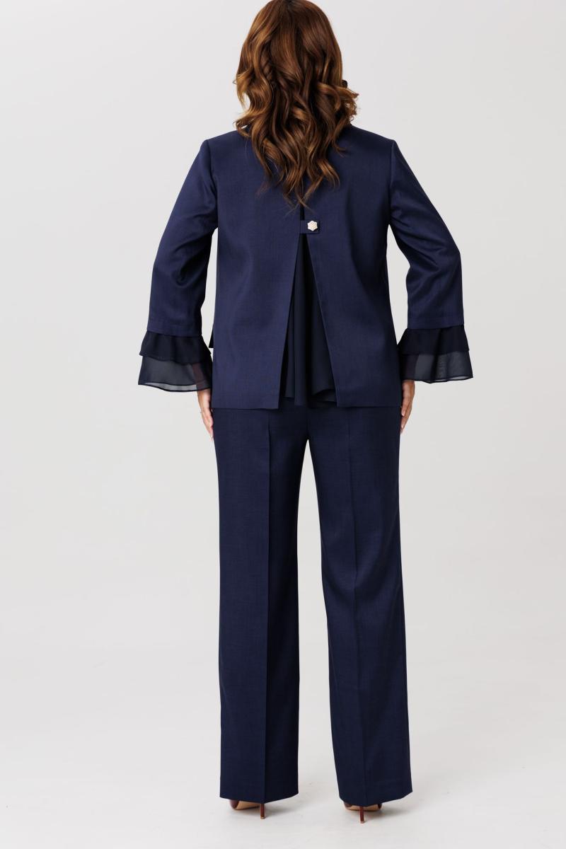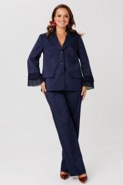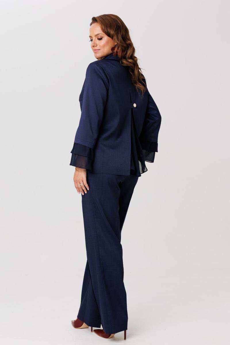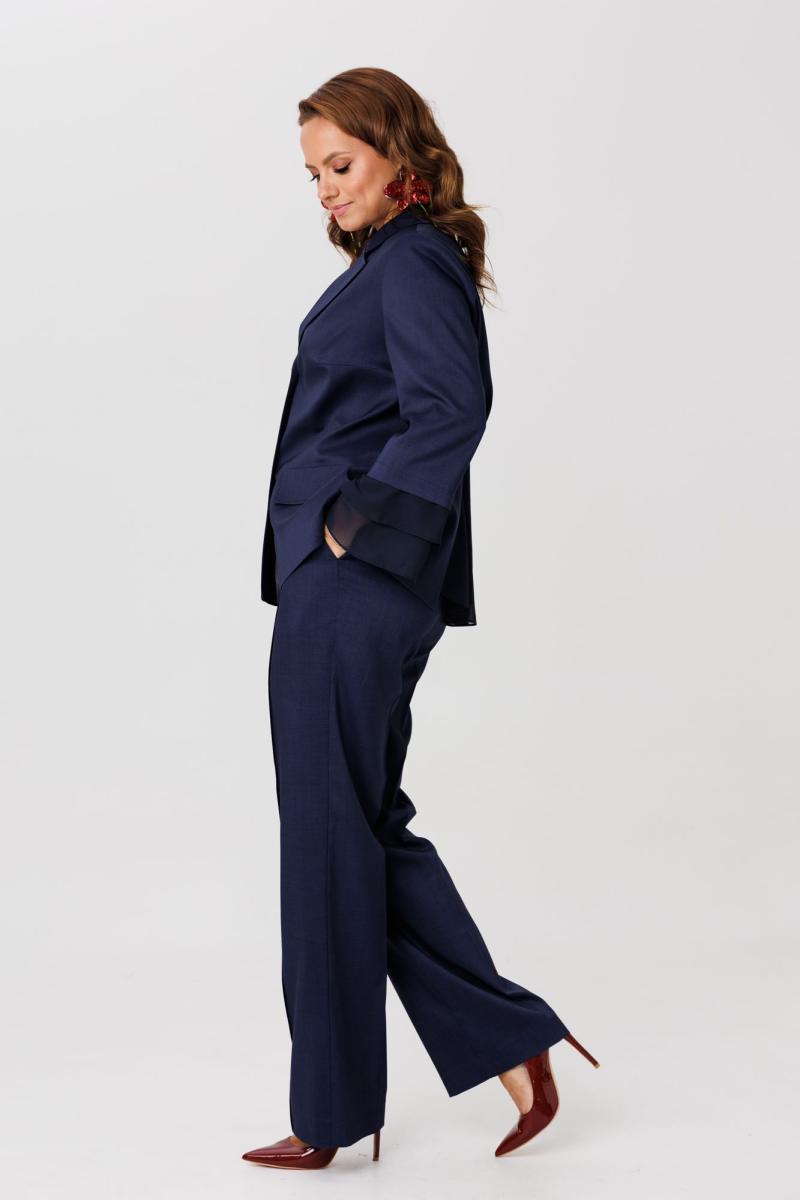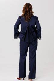 Костюм женский, состоящий из жакета и брюк, выполнен из костюмного полотна (чуть тянется). Жакет прямого силуэта с нагрудными вытачками по переду. Накладные клапаны, являются имитацией кармана. По горловине воротник с отложными бортами пиджачного типа. Застежка на три петли-пуговицы. По спинке центральный разрез эффектно оформлен декоративной вставкой из струящегося шифона, который дополняет отделочная пуговица (не функциональная при застегивании). Рукав втачной, двухшовный, длина 7/8. По низу рукава два притачных волана из шифоновой ткани. Жакет на подкладке. Брюки свободного кроя с высокой посадкой. В боковых швах функциональные карманы. Верхний срез брюк обработан притачным поясом с резинкой в боковых швах. Застежка в брюках на тесьму-молнию.