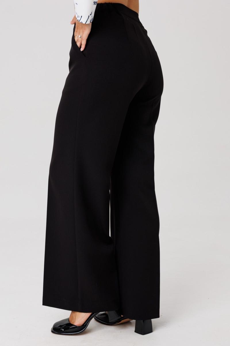 Нарядный женский костюм, состоящий из жакета и брюк. Жакет полуприлегающего силуэта, выполнен из трикотажного полотна (тянется), без подкладки. По переду нагрудная вытачка и отделочный клапан, центральная застежка на петли-пуговицы. Спинка со средними рельефными швами. Рукава втачные, двухшовные. Горловина оформлена воротником пиджачного типа с лацканом. Брюки прямого классического кроя с высокой посадкой, выполнены из костюмной ткани (чуть тянется) с наклонными карманами в боковых швах. По срезу банта – застежка-молния. Верхний срез оформлен поясом с эластичной резинкой по задней половинке.