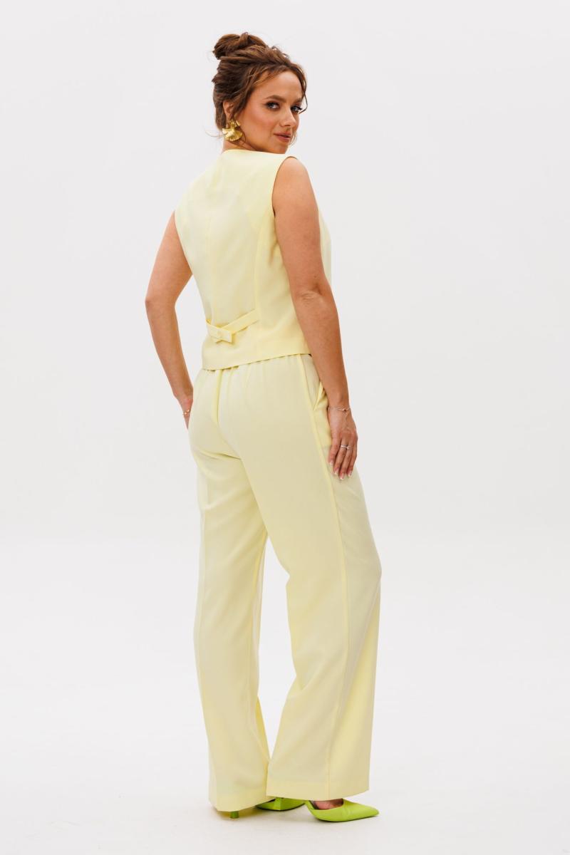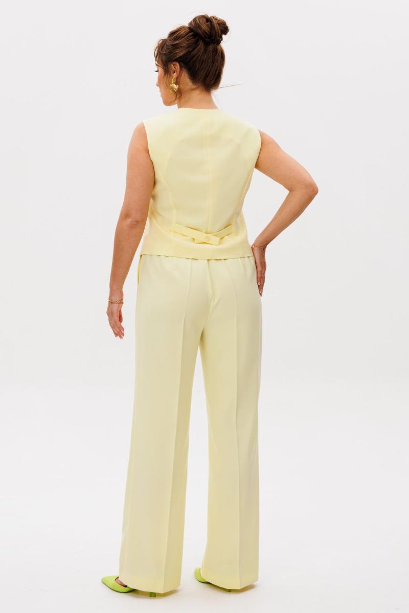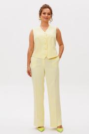 Жилет полуприлегающего силуэта на подкладке. Перед с талиевыми вытачками, с застежкой на петли-пуговицы и с фигурным низом. Горловина V-образного выреза. Спинка со средни швом, рельефными швами и отделочными хлястиками с пуговицей.