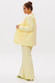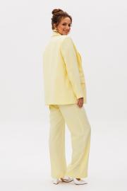 Жакет прямого кроя на подкладке. По переду отрезной бочок, нагрудные вытачки, функциональные прорезные карманы в рамку с клапаном, центральная застежка на петли-пуговицы. Горловина оформлена воротником пиджачного типа с лацканами. Спинка со средним швом. Рукава втачные, двухшоввные.