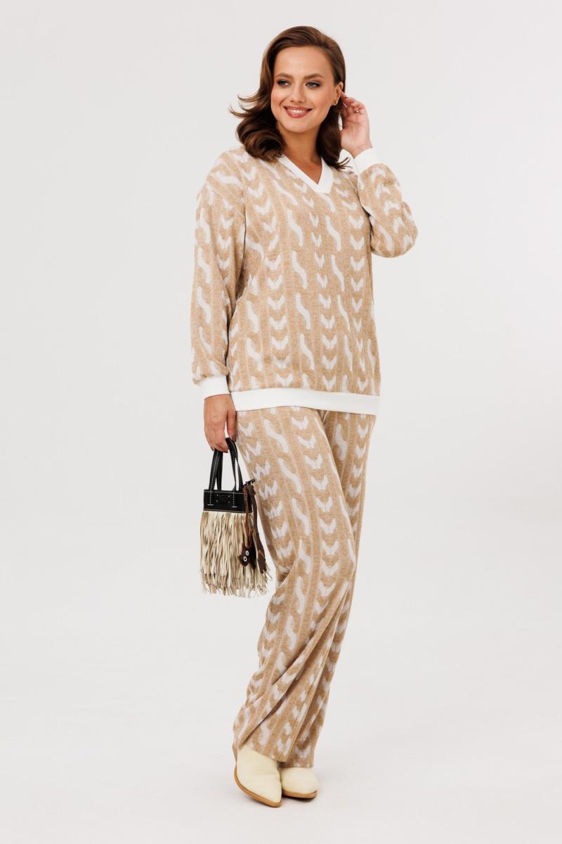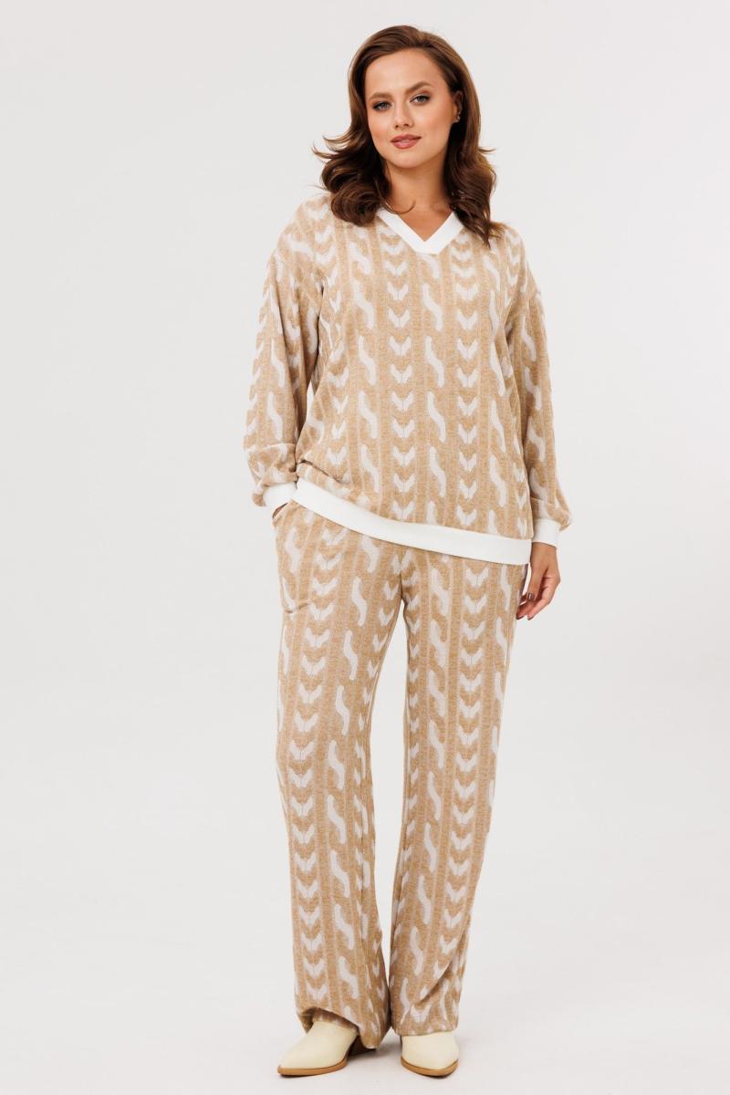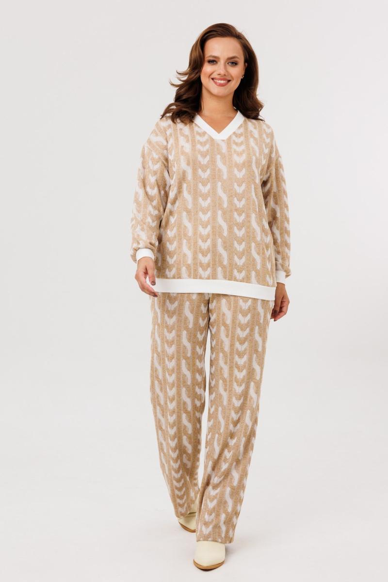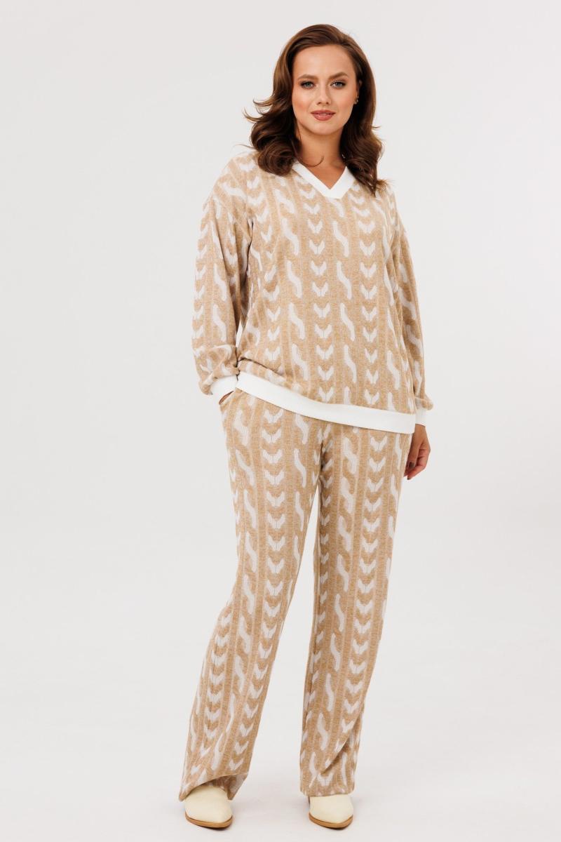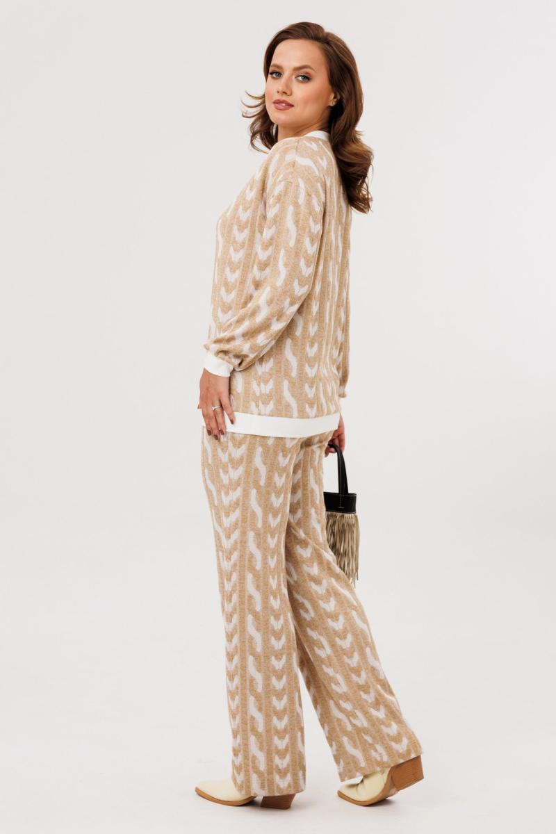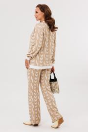 Стильный женский костюм, состоящий из джемпера и брюк. Джемпер прямого силуэта со спущенной линией плеча, выполненный из эластичного трикотажного полотна (тянется). Перед и спинка цельные. Горловина V-образной формы, оформлена довязом белого цвета, который освежает. Рукав одношовный. По низу рукава и низу джемпера – притачные манжеты из довяза. Брюки свободного прямого кроя с высокой посадкой, с карманами в боковых швах. Верхний срез брюк оформлен поясом с эластичной резинкой.