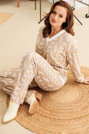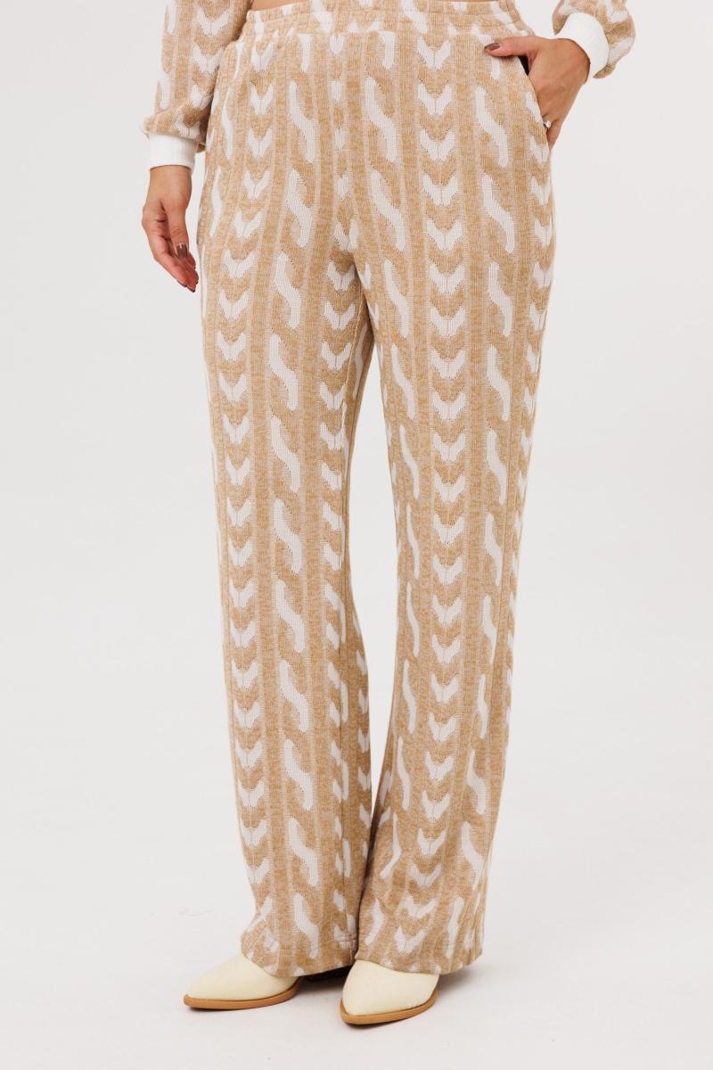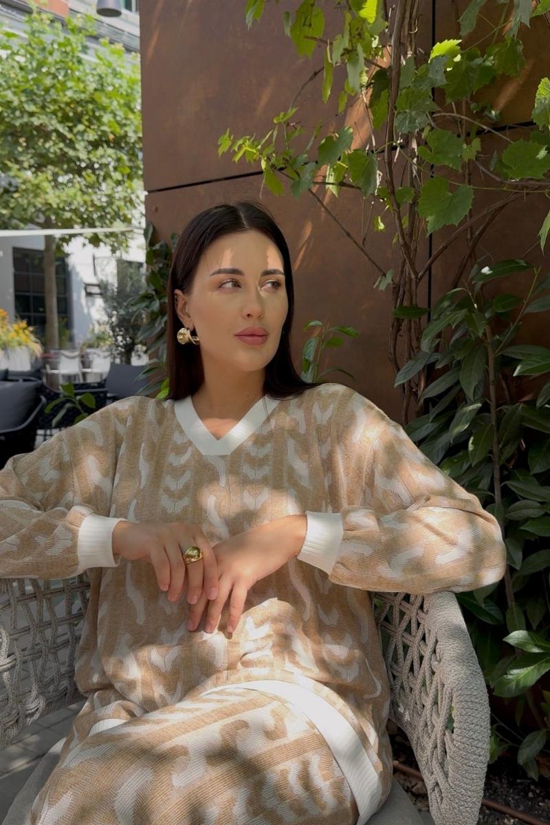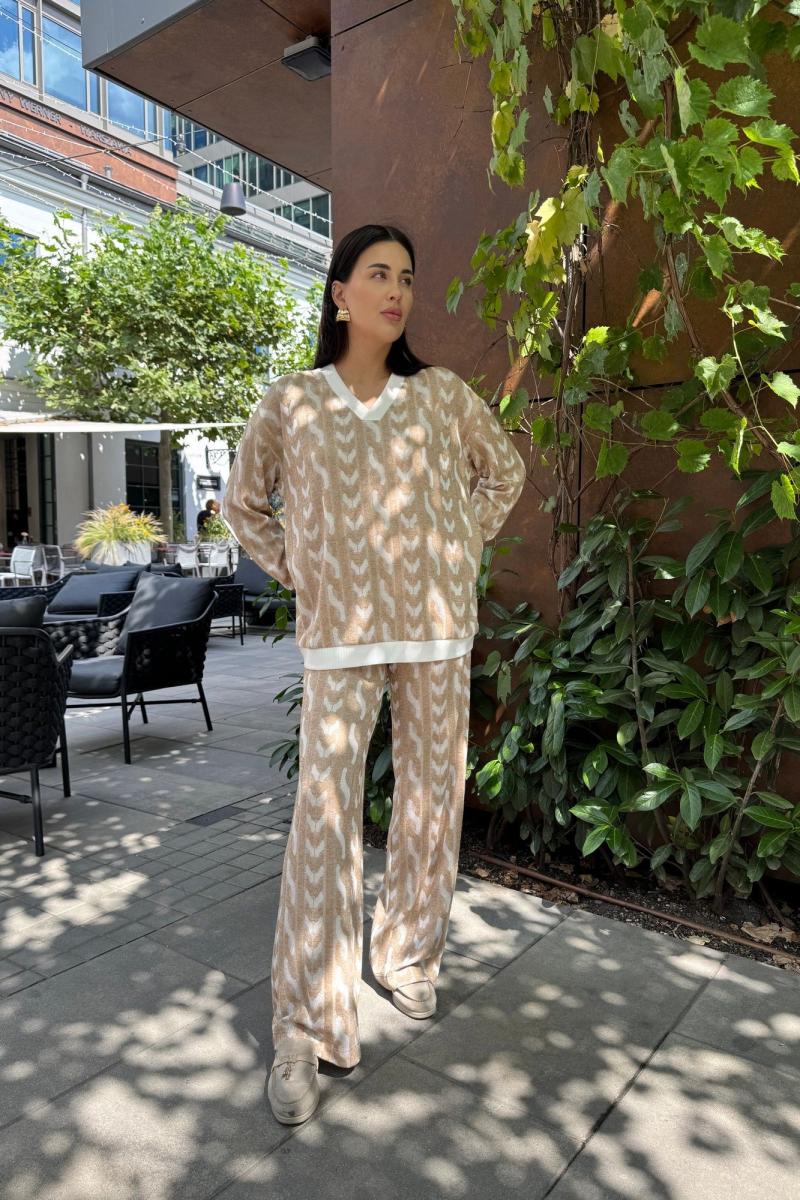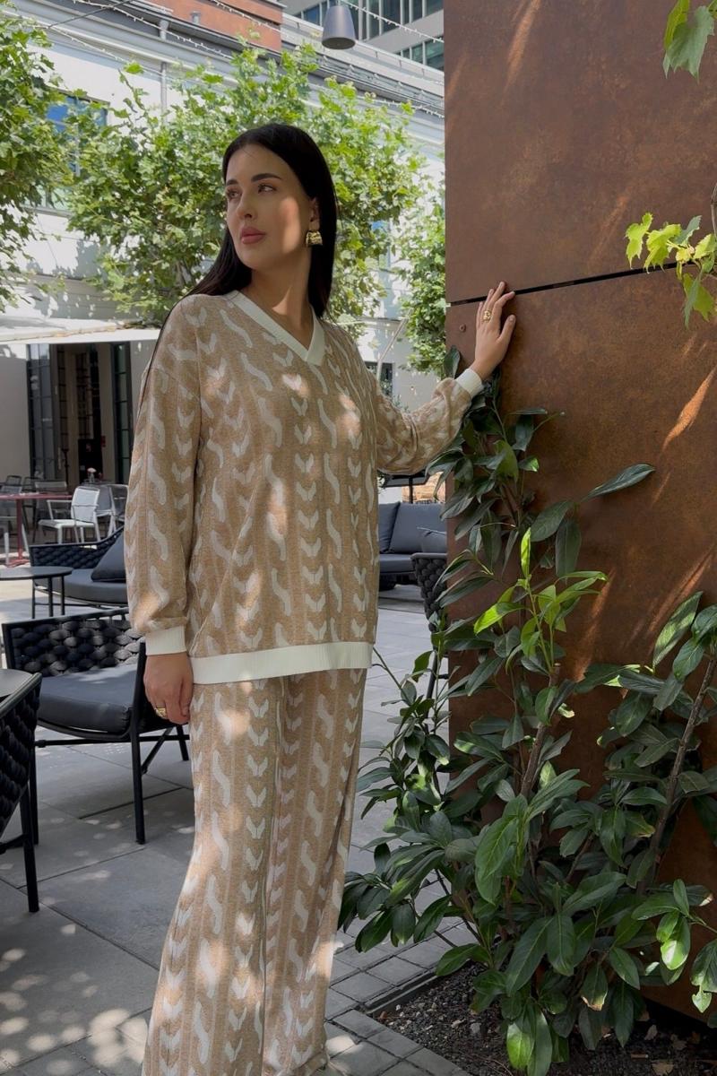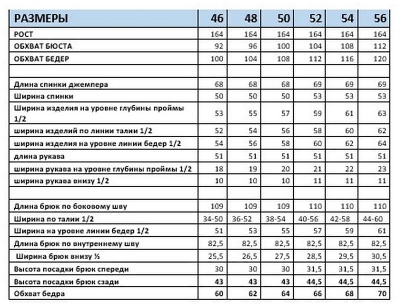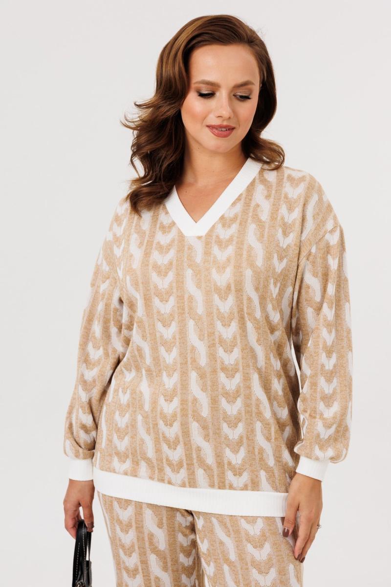 Стильный женский костюм, состоящий из джемпера и брюк. Джемпер прямого силуэта со спущенной линией плеча, выполненный из эластичного трикотажного полотна (тянется). Перед и спинка цельные. Горловина V-образной формы, оформлена довязом белого цвета, который освежает. Рукав одношовный. По низу рукава и низу джемпера – притачные манжеты из довяза. Брюки свободного прямого кроя с высокой посадкой, с карманами в боковых швах. Верхний срез брюк оформлен поясом с эластичной резинкой.