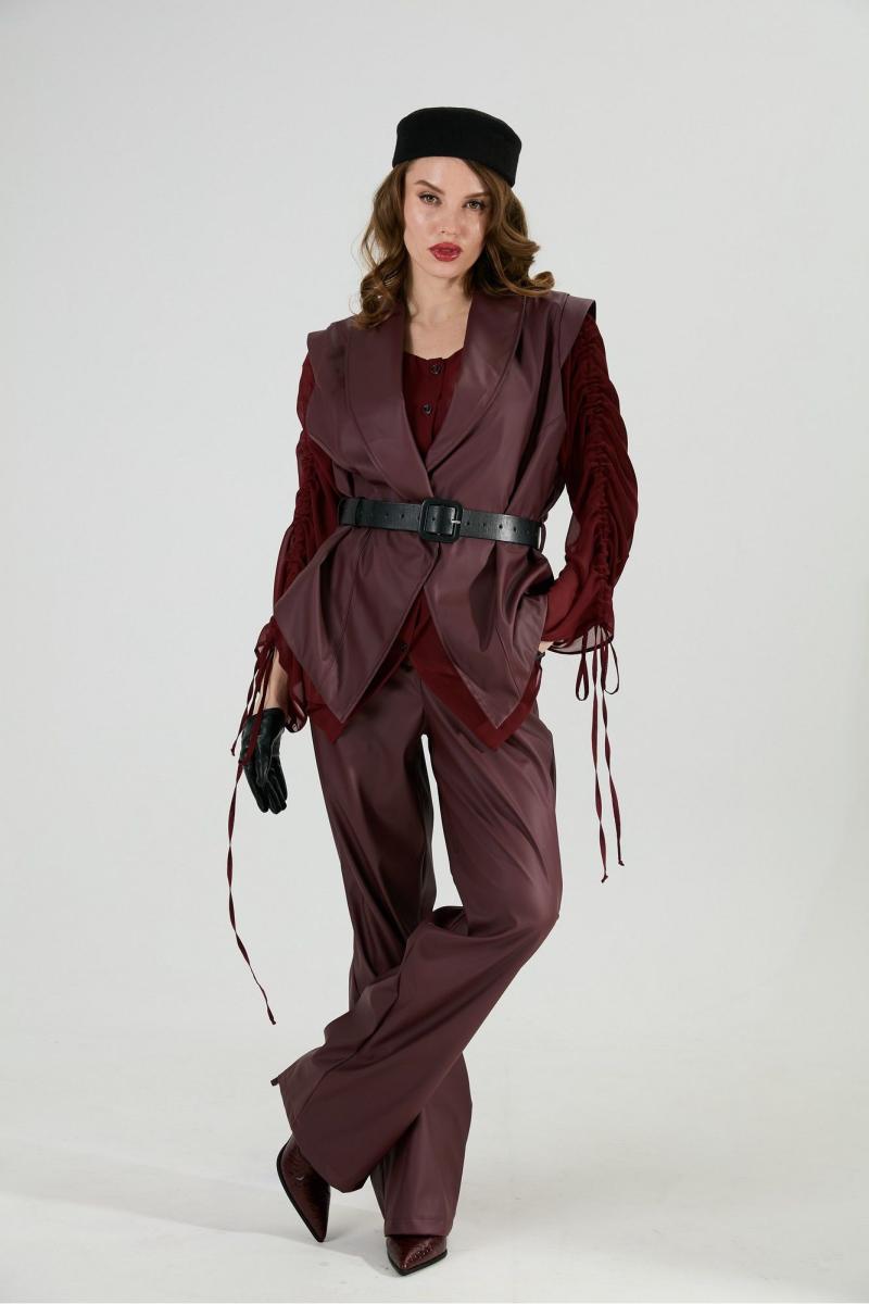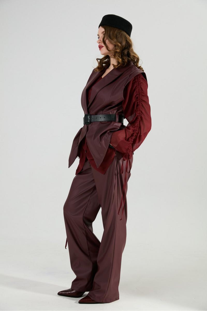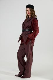 Костюм трехпредметный: состоит из блузы, брюк и жилета. Блуза прямого кроя с центральной застёжкой на петли и пуговицы. Вырез горловины глубокий округлый. Линия плеча приспущена. На рукавах изделия заложена декоративная сборка с регулируемыми завязками. В комплект к изделию идёт узкий пояс из основной ткани с авторским украшением ручной работы. Брюки свободного кроя, верхний срез представлен широкой резинкой, с карманами. Жилет удлиненный свободного прямого силуэта, воротник пиджачного типа. Линия низа по переду и спинке фигурная ассиметричная. Короткий рукав-крылышко. Талия фиксируется съемным ремнем из экокожи, для которого в боковых швах оформлены шлевки. Ремень идёт в комплекте к изделию.
