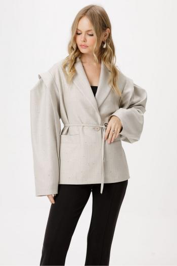 Текстильный костюм-двойка из жакета с декоративной отделкой и прямых брюк со стрелками. Детали: жакет полуприлегающего силуэта, рельефные швы, пиджачный воротник, функциональные карманы, втачные длинные рукава, двубортная застежка на петли и пуговицы, спинка со шлицей, жакет на подкладке. Брюки с высокой посадкой на притачном поясе со шлевками, передние половины с небольшими застроченными мягкими складками и заутюженными стрелками, застежка на молнию и пуговицу, боковые карманы.